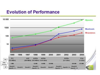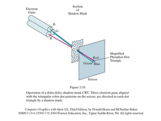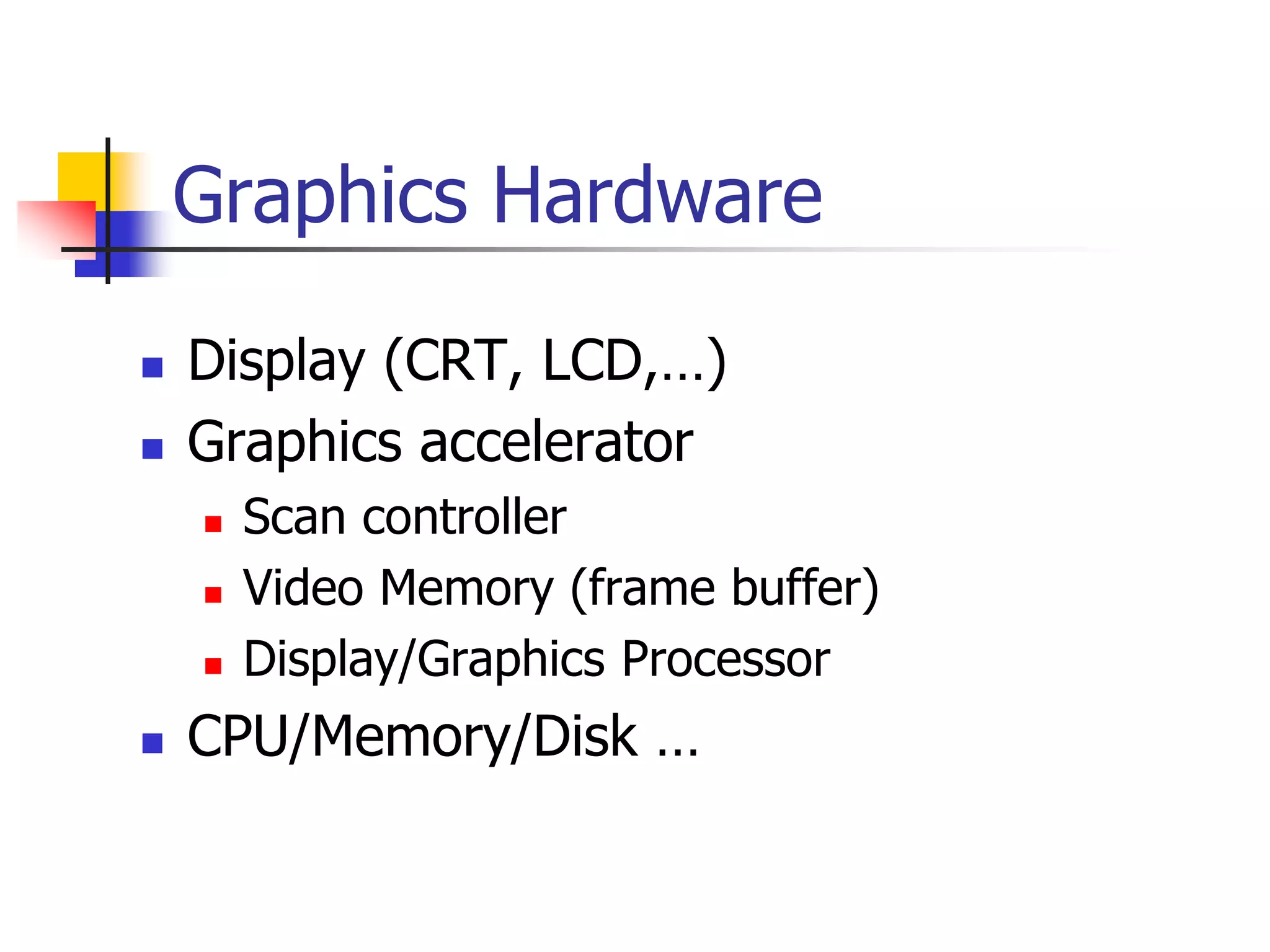 This document discusses graphics hardware components and display technologies. It describes the basic components of a graphics system including the display, graphics accelerator, video memory, and graphics processor. It then covers different display technologies such as CRT, LED, LCD, plasma panels, DLP, and OLED. It discusses various trade-offs between these technologies like cost, power consumption, resolution, brightness, etc. The document goes on to describe specific display technologies in more detail like CRTs, color CRTs, LED, LCD, plasma panels, and DLP. It also covers topics like raster vs vector graphics, frame buffers, refresh rates, scan controllers, graphics buses, graphics accelerators, and GPUs.