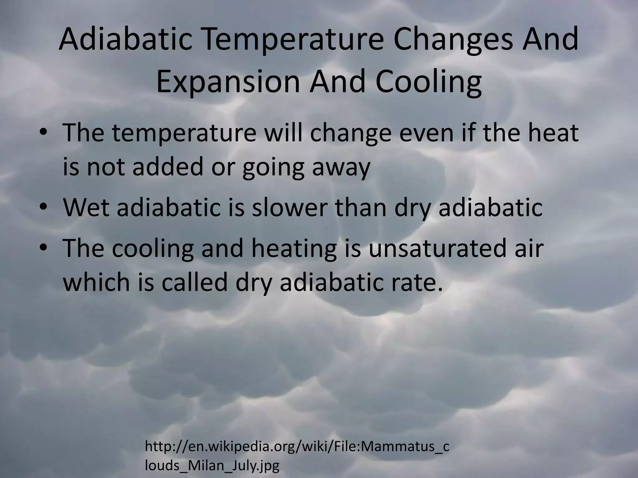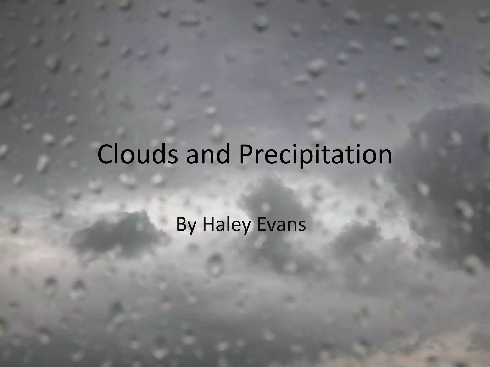 This document discusses various mechanisms that cause clouds and precipitation to form, including adiabatic temperature changes, orographic lifting, frontal wedging, convergence, and localized convective lifting. It describes different types of clouds like cirrus, cumulus, and stratus clouds. It also covers topics like stability, condensation, high, middle and low clouds, clouds with vertical development, fog formation, cold and warm cloud precipitation processes, and types of precipitation like rain, snow, sleet, glaze and hail.