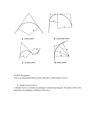 This document discusses horizontal curves used in transportation infrastructure to gradually change the direction of roads, railways, and other linear structures. It defines simple, compound, and reverse circular curves used for this purpose. Simple curves are arcs of a circle defined by their radius, while compound curves consist of two simple curves joined together curving in the same direction. Reverse curves curve in opposite directions. Spiral curves with varying radii are also used. The document then provides details on calculating elements of simple circular curves like radius, tangent distance, external distance, middle ordinate, and degree of curvature using standard geometric relationships. It concludes with describing the deflection angle method for laying out horizontal curves in the field using one or two theodolites.