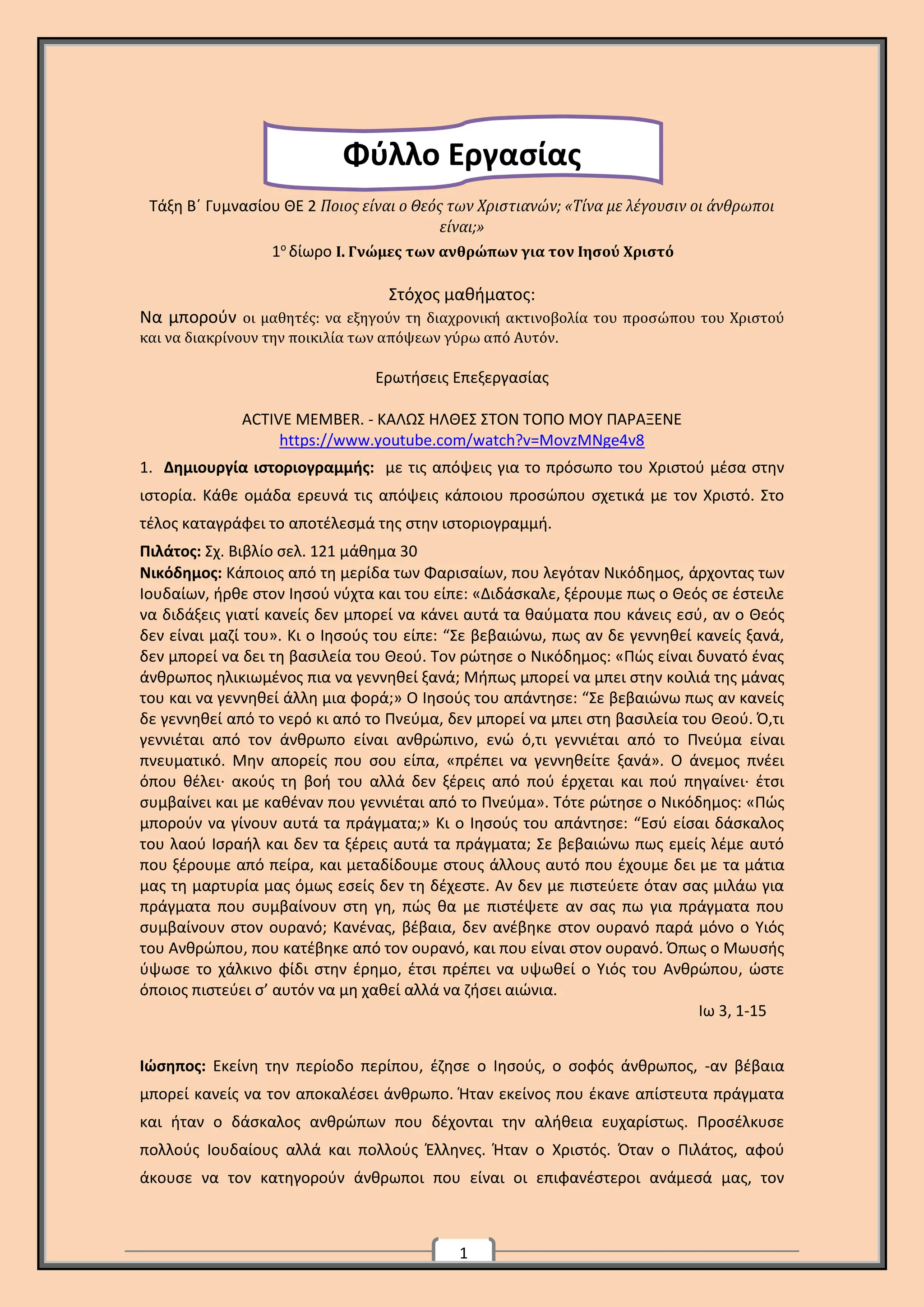 ιστορία. Κάθε ομάδα ερευνά τις απόψεις κάποιου προσώπου σχετικά με τον Χριστό. Στο
