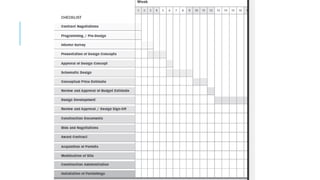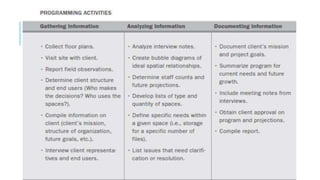 The document outlines the interior design process, beginning with programming to define the client's needs, creating a schedule and budget, and developing the design. Programming involves gathering information through questionnaires, interviews, or inventories. It is important for good communication and managing expectations. The schedule addresses project milestones and assigns responsibilities, while the budget separates hard costs like construction from soft costs such as fees. Design development then transforms the client's needs into a practical and aesthetic solution. A mood board with physical samples of materials like fabrics, carpet, tiles, and paint is created to inspire the design.