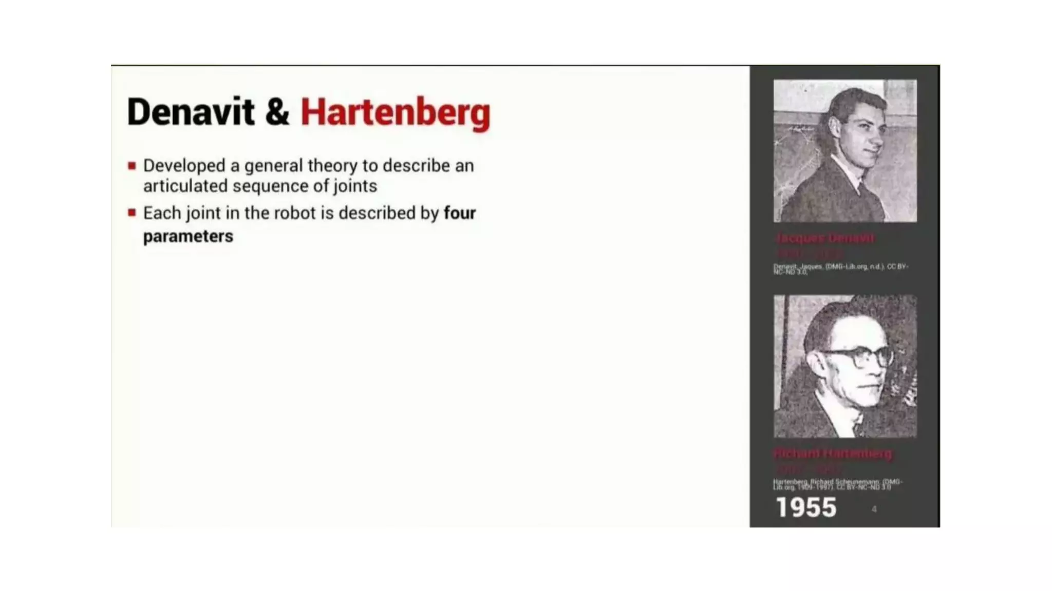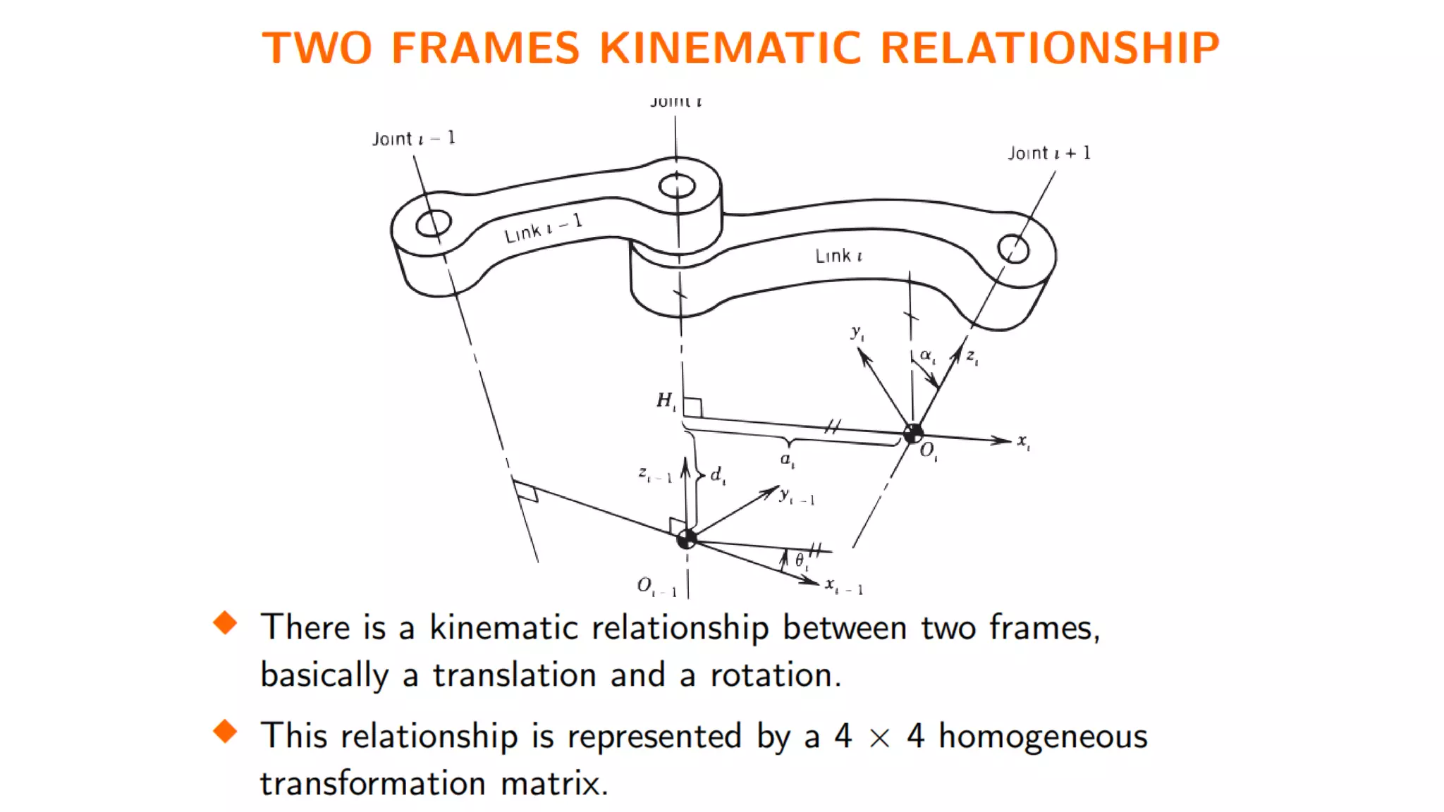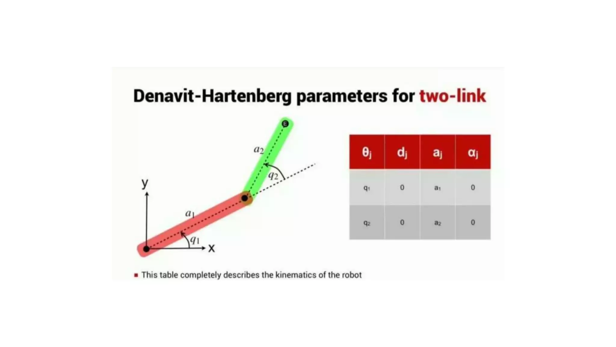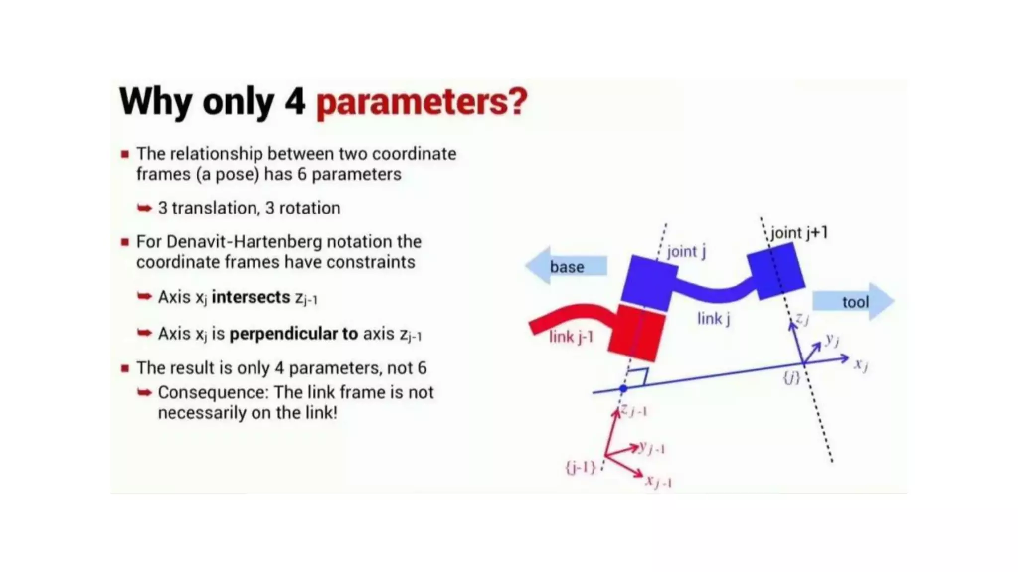- The Denavit-Hartenberg (DH) convention defines a mathematical representation of a robot's kinematic structure using link parameters like link length, twist, offset and joint angle.