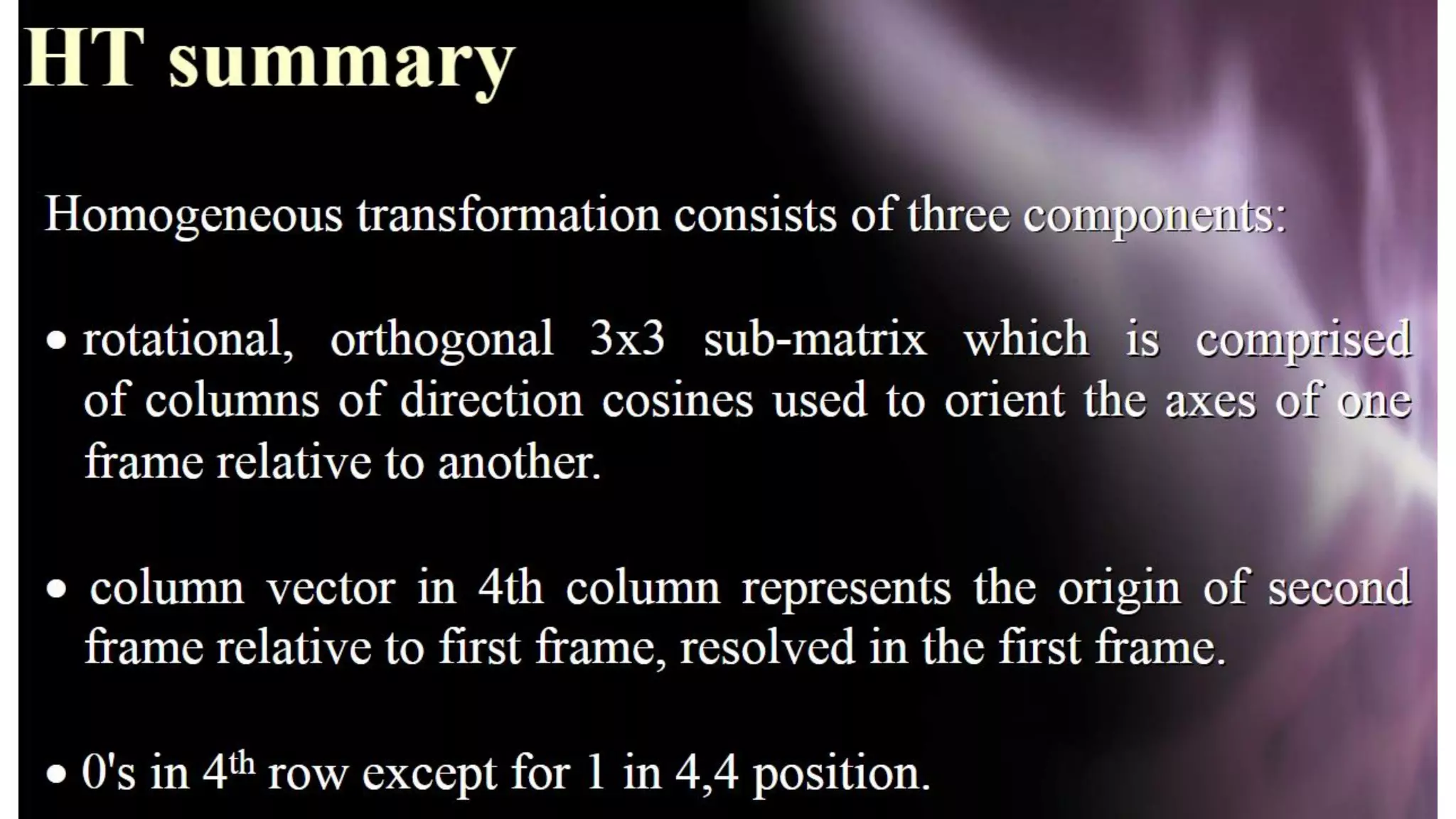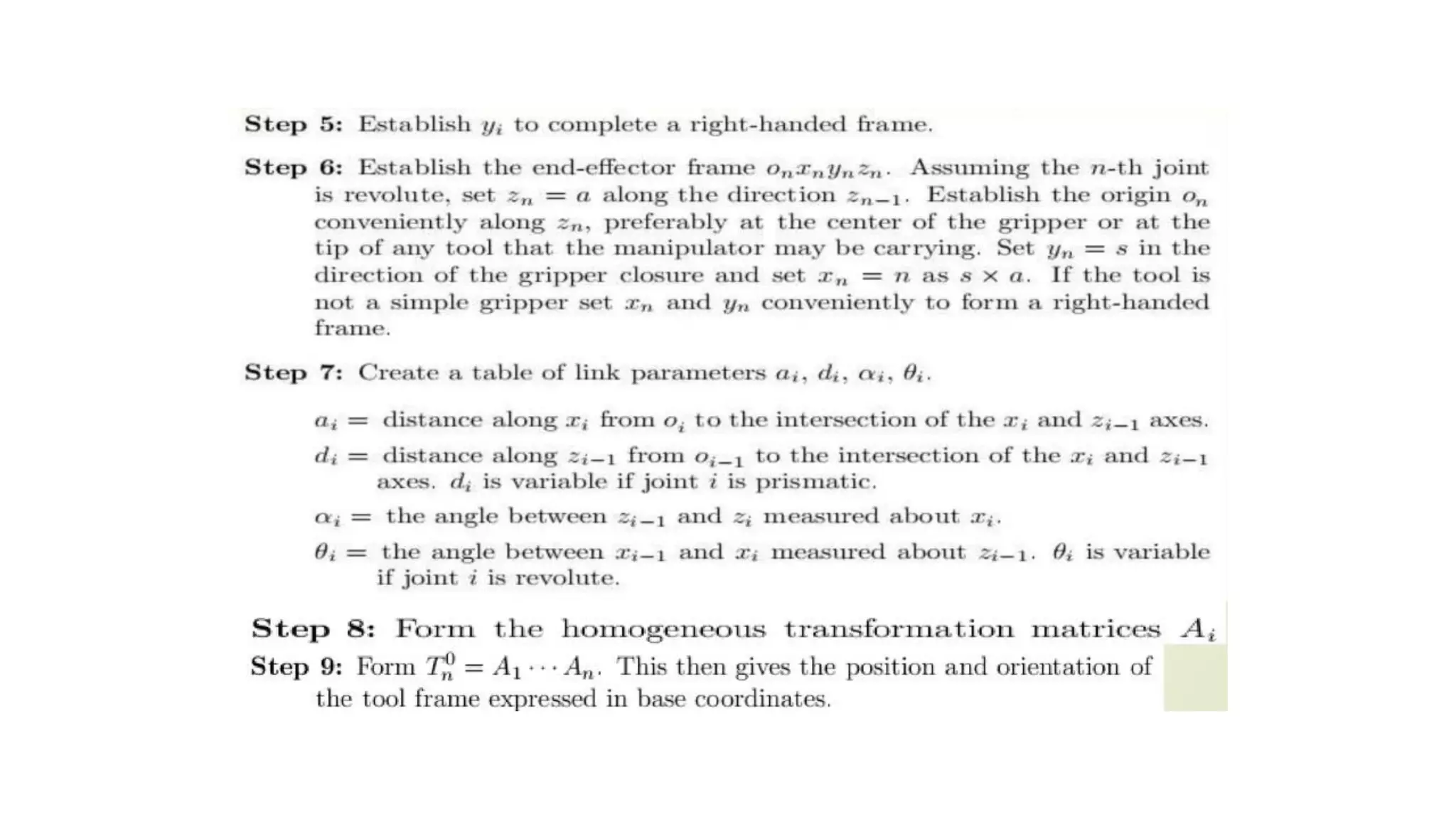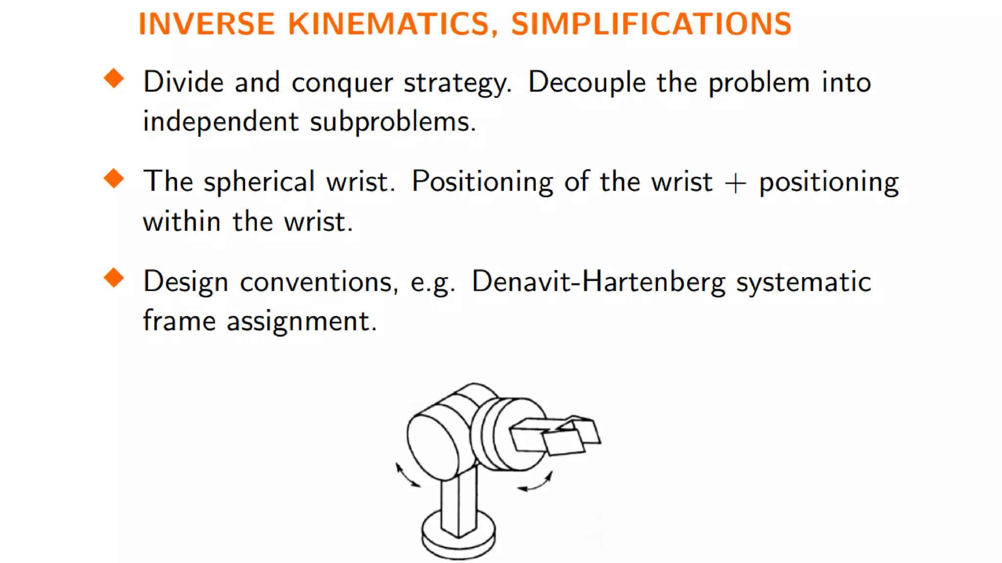 - The Denavit-Hartenberg (DH) convention defines a mathematical representation of a robot's kinematic structure using link parameters like link length, twist, offset and joint angle.
