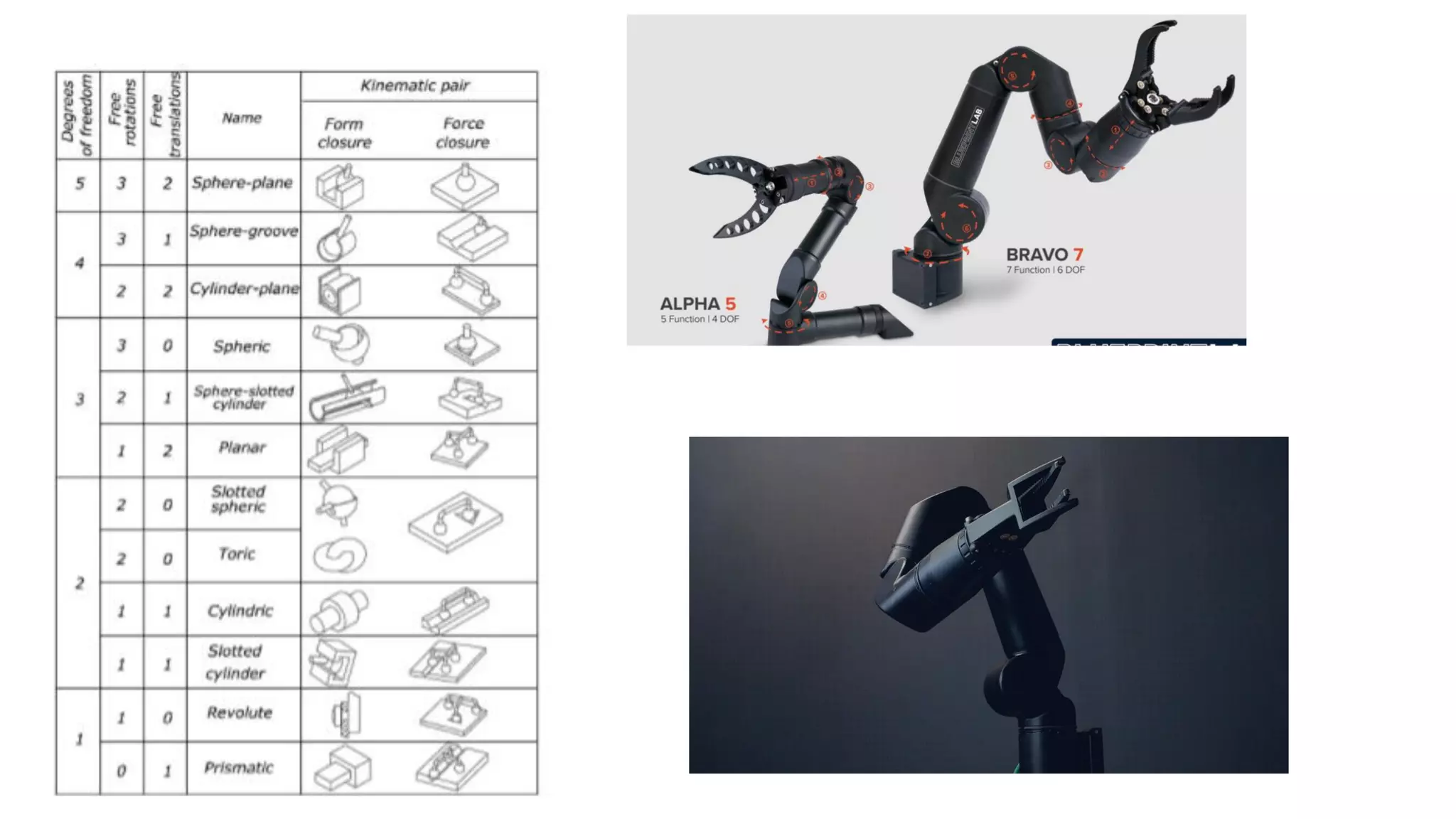 - A robot's degrees of freedom depend on the number and type of joints. Common robotic arm designs have between 3-7 DOF.