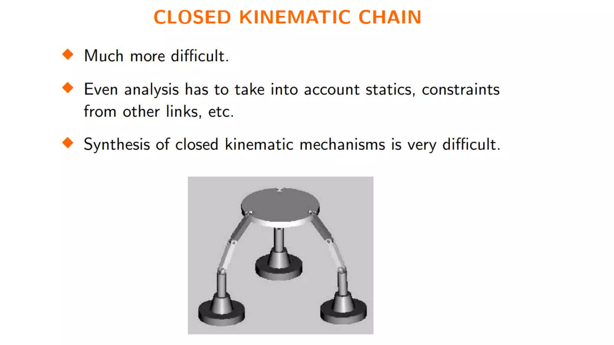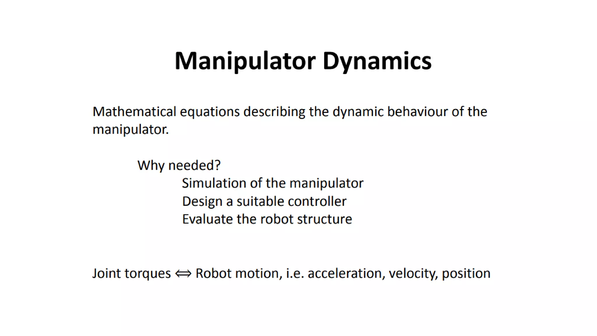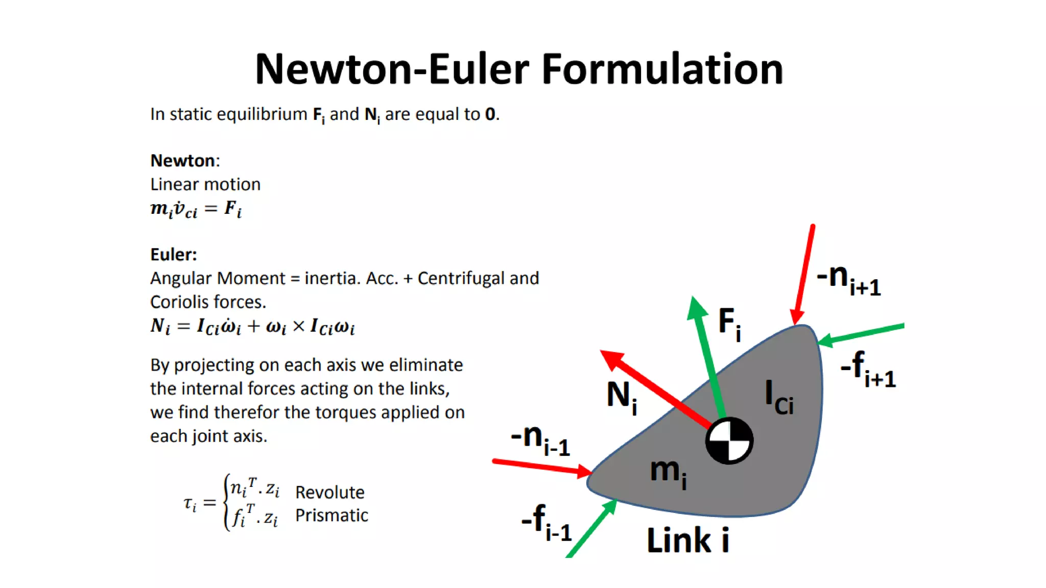 - There are different types of joints (revolute, prismatic, etc.) and each provides a degree of freedom (DOF) of motion.