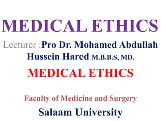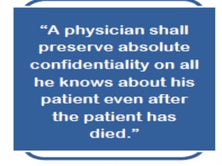 This document discusses key concepts in medical ethics, including the physician-patient relationship, respect and equal treatment of patients, informed consent, and confidentiality. It notes that while medical ethics can vary between countries and over time, core principles like compassion, competence, and autonomy remain important. The World Medical Association plays an important role in establishing global ethical standards for physicians. Ultimately, individual physicians must apply ethical principles to specific situations and make their own decisions.
