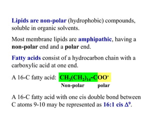 This document discusses lipids and membranes. It describes the basic structures of lipids like fatty acids, glycerophospholipids, sphingolipids, and cholesterol. These lipids can assemble into structures like micelles and bilayers in aqueous environments due to their amphipathic nature. Bilayers allow for the formation of cell membranes. Membranes contain proteins that can be integral, peripheral, or lipid-anchored. Lipid composition and proteins influence membrane properties like fluidity.