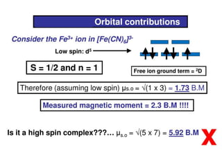 3. Both spin and orbital contributions give rise to magnetic moments. The spin-only formula is discussed and applied to examples. Orbital contributions are also explained.