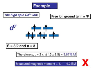 2. For transition metals, magnetism arises mainly from partially filled d-orbitals. The magnetic moment can provide information about the number of unpaired electrons, high-spin vs low-spin complexes, spectral behavior, and structure.