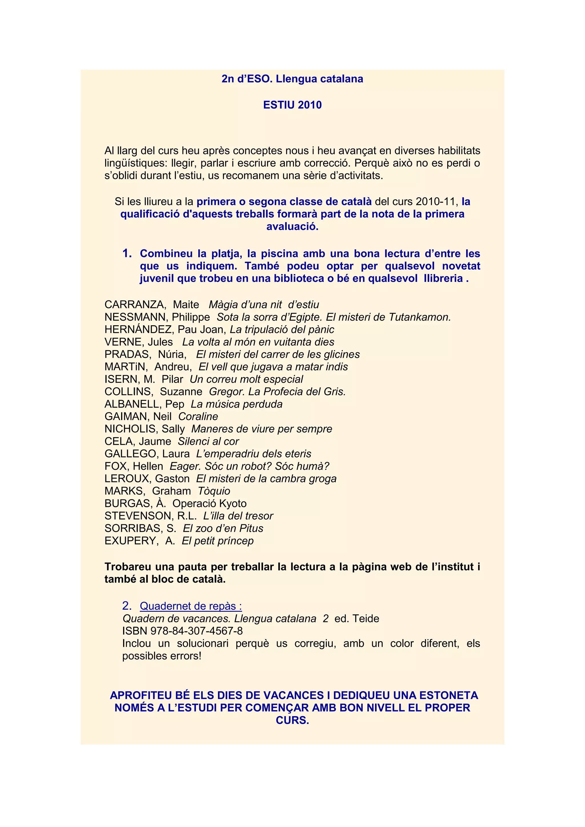 2n d’ESO. LlenguacatalanaESTIU 2010 Al llarg del curs heu après conceptes nous i heu avançat en diverses habilitats lingüístiques: llegir, parlar i escriure amb correcció. Perquè això no es perdi o s’oblidi durant l’estiu, us recomanem una sèrie d’activitats.Si les lliureu a la primera o segona classe de català del curs 2010-11, la qualificació d'aquests treballs formarà part de la nota de la primera avaluació.Combineu la platja, la piscina amb una bona lectura d’entre les que us indiquem. També podeu optar per qualsevol novetat juvenil que trobeu en una biblioteca o bé en qualsevol llibreria .CARRANZA, Maite Màgia d’una nit d’estiuNESSMANN, Philippe Sota la sorra d’Egipte. El misteri de Tutankamon.HERNÁNDEZ, Pau Joan, La tripulació del pànicVERNE, Jules La volta al món en vuitanta diesPRADAS, Núria, El misteri del carrer de les glicinesMARTiN, Andreu, El vell que jugava a matar indisISERN, M. Pilar Un correu molt especialCOLLINS, Suzanne Gregor. La Profecia del Gris.ALBANELL, Pep La música perdudaGAIMAN, Neil CoralineNICHOLIS, Sally Maneres de viure per sempreCELA, Jaume Silenci al corGALLEGO, Laura L’emperadriu dels eterisFOX, Hellen Eager. Sóc un robot? Sóc humà?LEROUX, Gaston El misteri de la cambra grogaMARKS, Graham TòquioBURGAS, À. Operació KyotoSTEVENSON, R.L. L’illa del tresorSORRIBAS, S. El zoo d’en PitusEXUPERY, A. El petit príncepTrobareu una pauta per treballar la lectura a la pàgina web de l’institut i també al bloc de català.Quadernet de repàs : Quadern de vacances. Llengua catalana 2 ed. TeideISBN 978-84-307-4567-8Inclou un solucionari perquè us corregiu, amb un color diferent, els possibles errors! APROFITEU BÉ ELS DIES DE VACANCES I DEDIQUEU UNA ESTONETA NOMÉS A L’ESTUDI PER COMENÇAR AMB BON NIVELL EL PROPER CURS.<br />