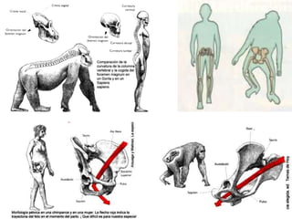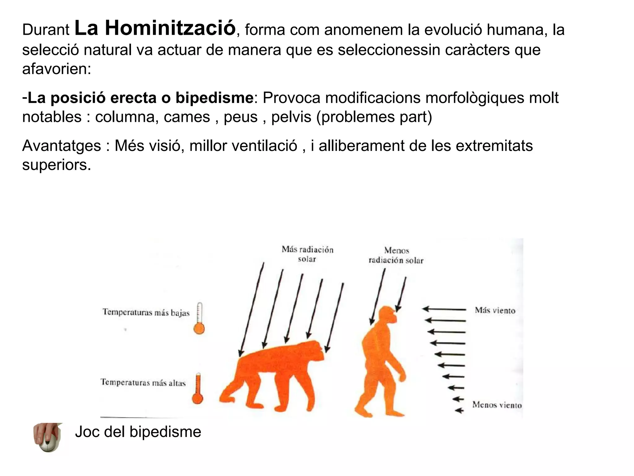 Durant LaHominització , forma com anomenem la evolució humana, la selecció natural va actuar de manera que es seleccionessin caràcters que afavorien: La posició erecta o bipedisme : Provoca modificacions morfològiques molt notables : columna, cames , peus , pelvis (problemes part) Avantatges : Més visió, millor ventilació , i alliberament de les extremitats superiors. Joc del bipedisme