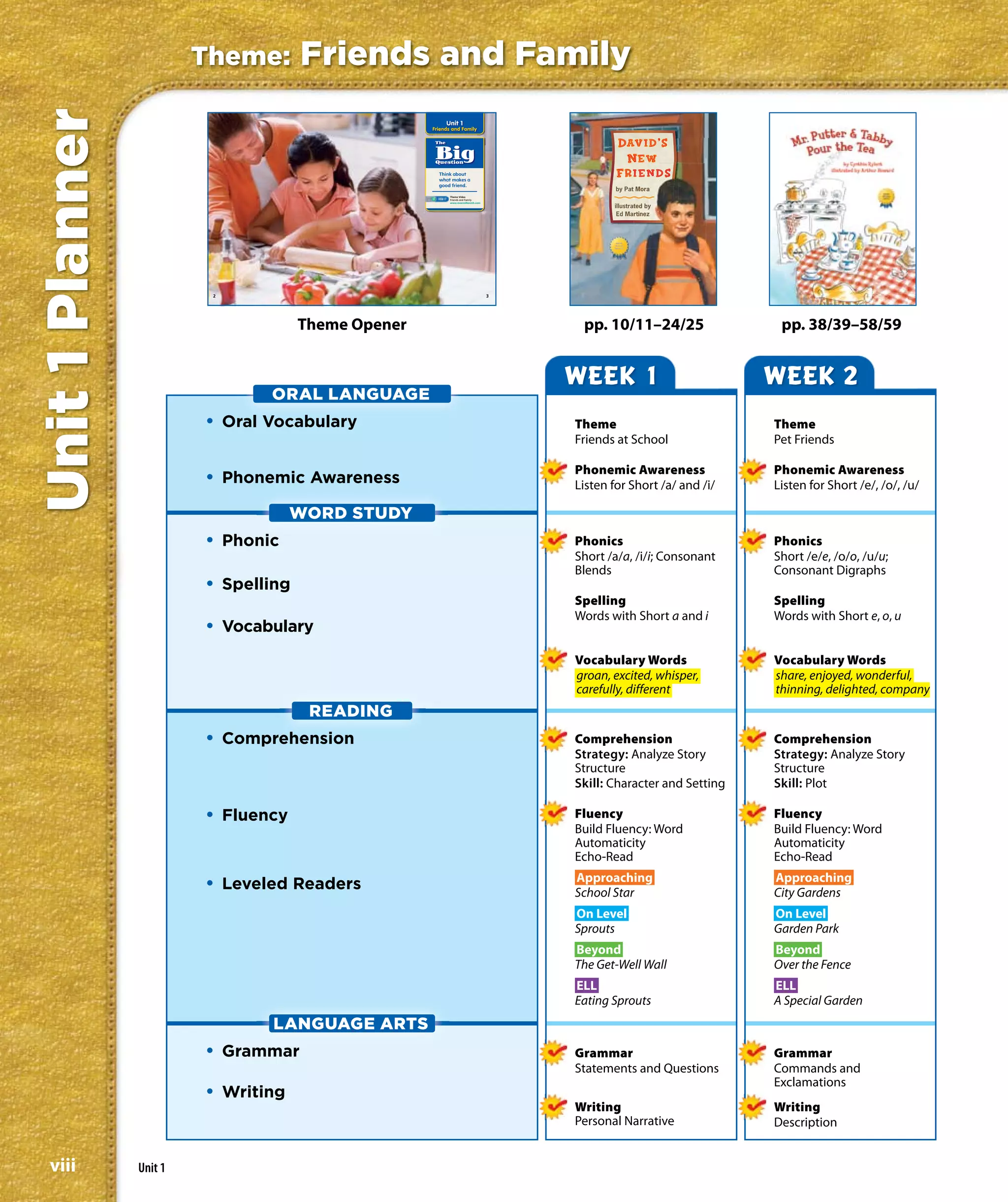 This document provides a unit planner for a theme on friends and family. It includes two weeks of lessons focusing on oral language, word study, reading, language arts, and leveled readers. The lessons cover topics like phonemic awareness, phonics, spelling, vocabulary, comprehension strategies, fluency building, grammar, and writing. The unit aims to help students think about what makes a good friend and uses stories and activities to explore themes of friends at school and pet friends.