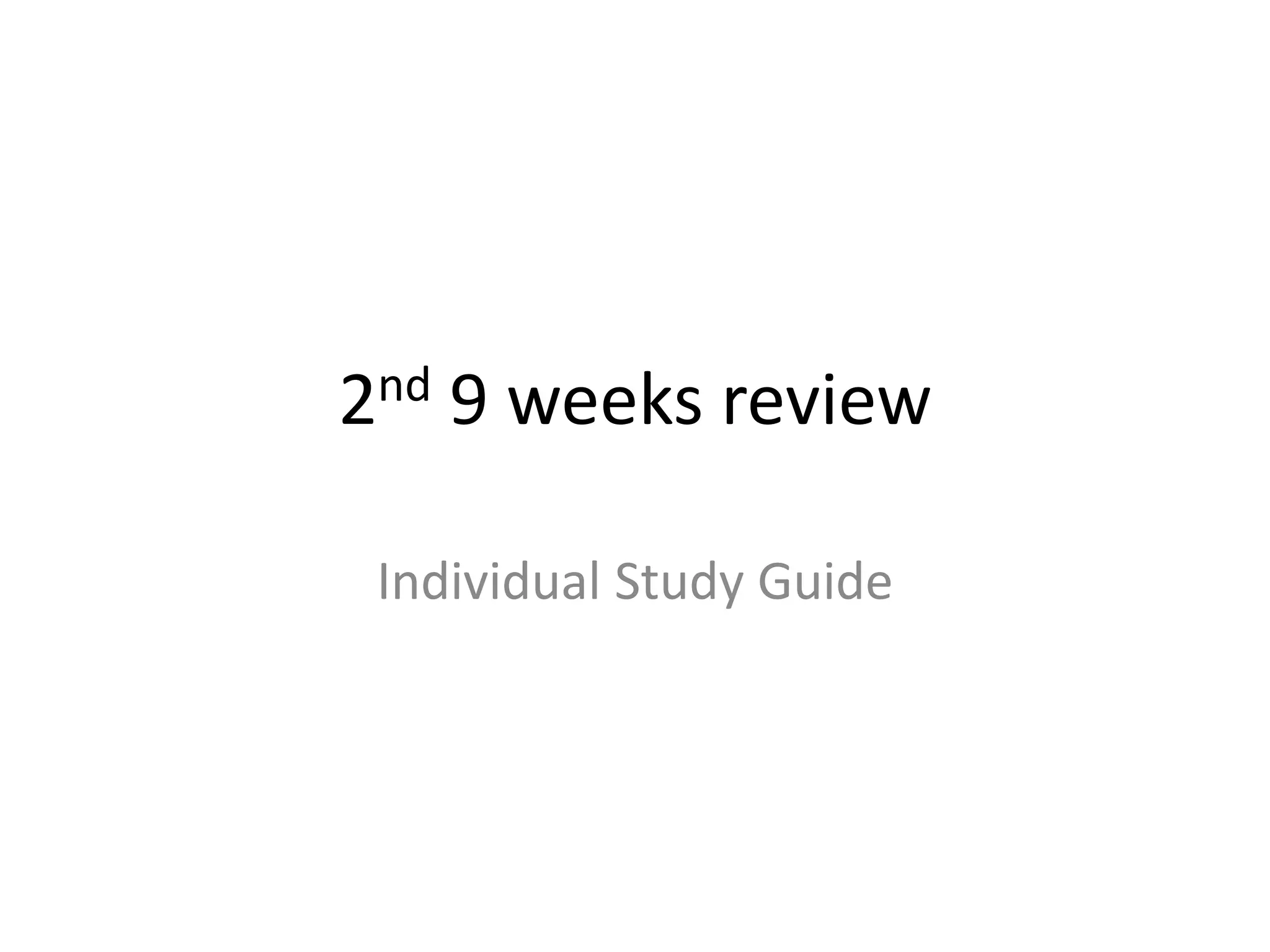 This document contains a study guide for a 2nd 9 weeks math review. It includes 29 practice problems covering various math topics like inequalities, proportions, scale drawings, unit rates, and solving equations. For each problem, students are instructed to show their work on paper and review the answers provided after sets of problems. The goal is to prepare for an upcoming math test by working through examples and checking answers.