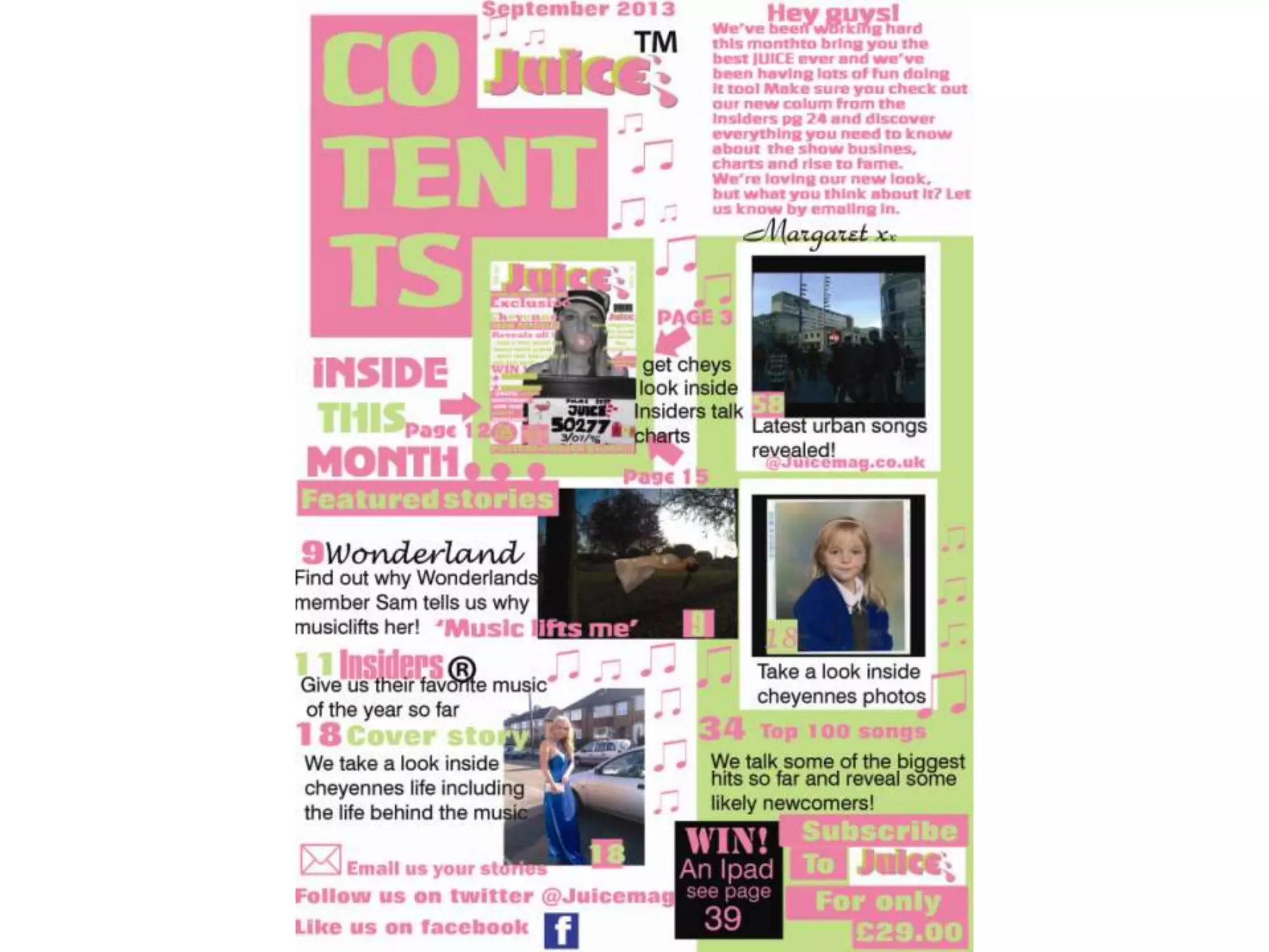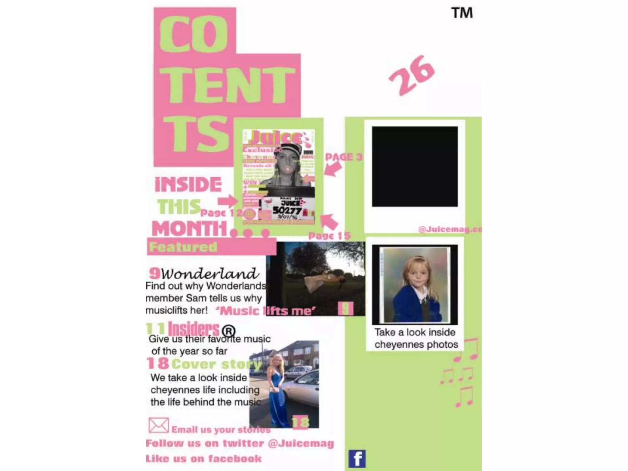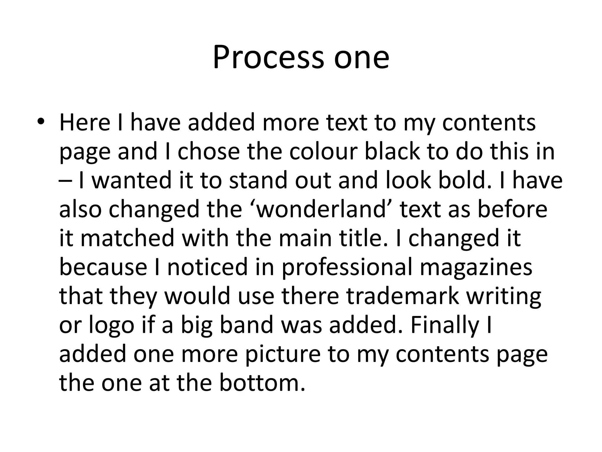 The document describes five processes for designing the contents page of a music magazine. In process one, the designer adds more text in black to the contents page and changes the "wonderland" text. In process two, the designer adds the Juice logo and details like music notes to brand it as a music magazine. In process three, the designer experiments with changing the color of a "win" box but decides it looks too dark. In process four, an urban photo and caption are added. In process five, the designer realizes an editor's letter was forgotten and goes back to research and add one with common features like an informal tone and signature.