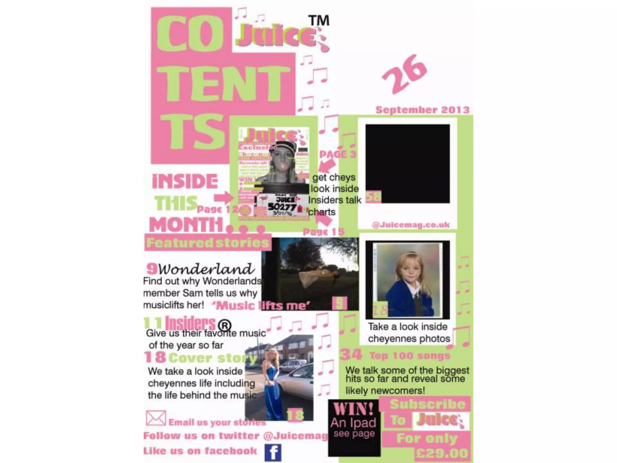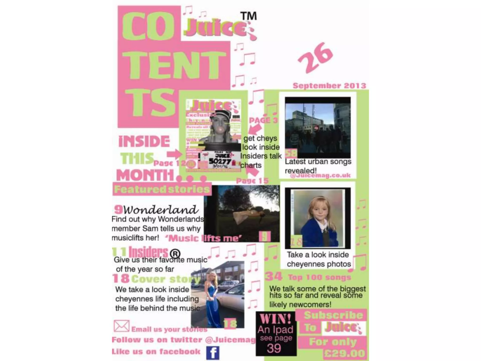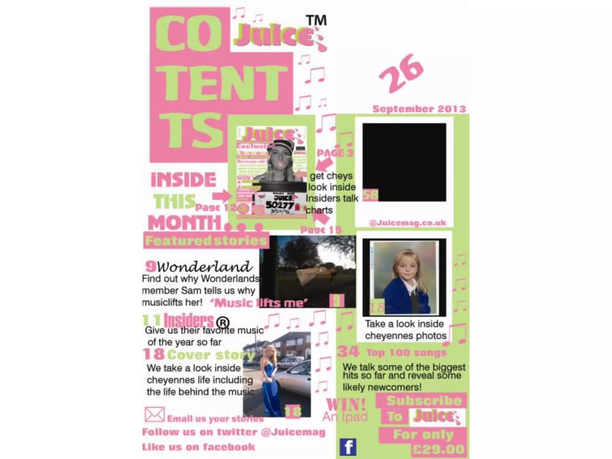The document describes five processes for designing the contents page of a music magazine. In process one, the designer adds more text in black to the contents page and changes the "wonderland" text. In process two, the designer adds the Juice logo and details like music notes to brand it as a music magazine. In process three, the designer experiments with changing the color of a "win" box but decides it looks too dark. In process four, an urban photo and caption are added. In process five, the designer realizes an editor's letter was forgotten and goes back to research and add one with common features like an informal tone and signature.