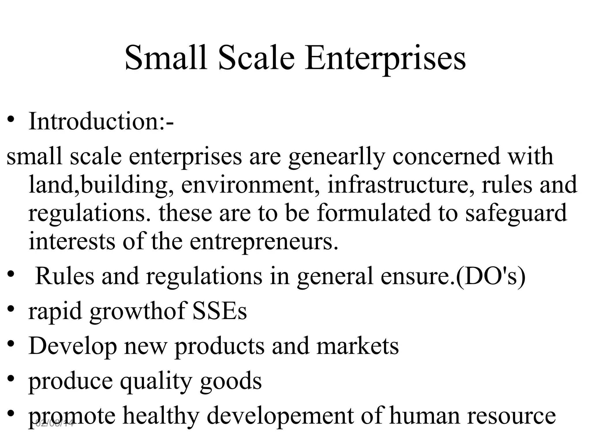 The document provides information on starting small scale enterprises in India. It discusses rules and regulations small enterprises must follow, including not polluting the environment, exploiting labor, or cheating customers. It also lists important acts related to small enterprises, such as those governing factories, labor disputes, contracts, wages, and more. The document defines small enterprises and categories within small enterprises, such as tiny industries, export-oriented units, and service businesses. It discusses characteristics, advantages, and the role of small enterprises in economic development, including increasing employment, production, and exports over decades. Finally, it outlines the steps to start a small enterprise, including selecting a project and location, feasibility studies, deciding the business structure, and obtaining necessary approvals