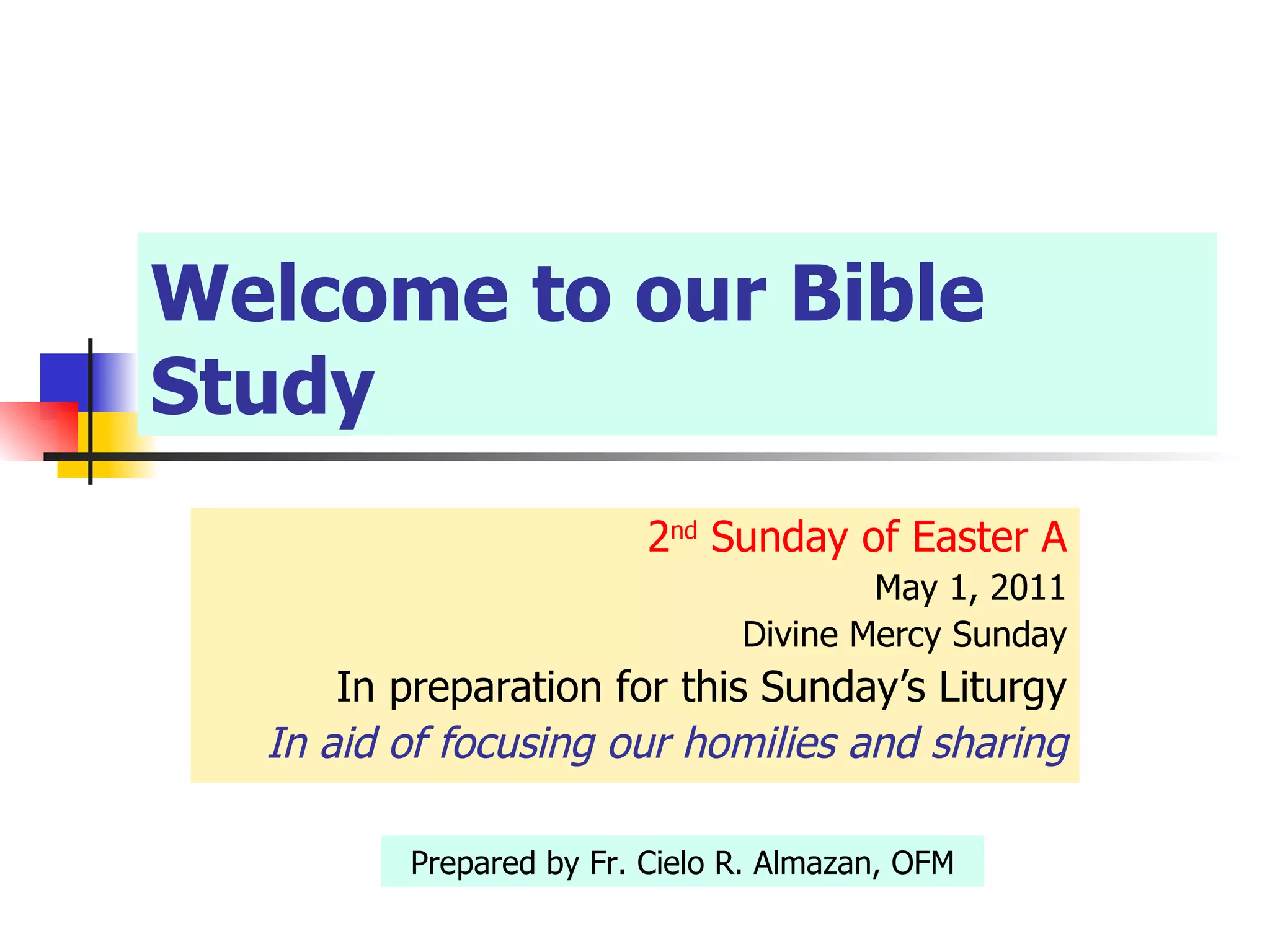 The document provides an overview of the Bible study for the second Sunday of Easter, including summaries and commentary on the readings. The first reading from Acts describes the early Christian community devoting themselves to teaching, communal life, breaking bread, and prayer. The second reading from 1 Peter discusses the new birth Christians receive through Christ's resurrection and finding joy even when suffering. The Gospel reading recounts Jesus' appearance to the disciples after his resurrection and their commissioning to forgive sins, as well as Thomas' later appearance and profession of faith.
