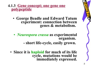 1) Beadle and Tatum's experiment using bread mold Neurospora showed that each gene encodes the structure of one polypeptide, supporting the "one gene, one enzyme" hypothesis.
