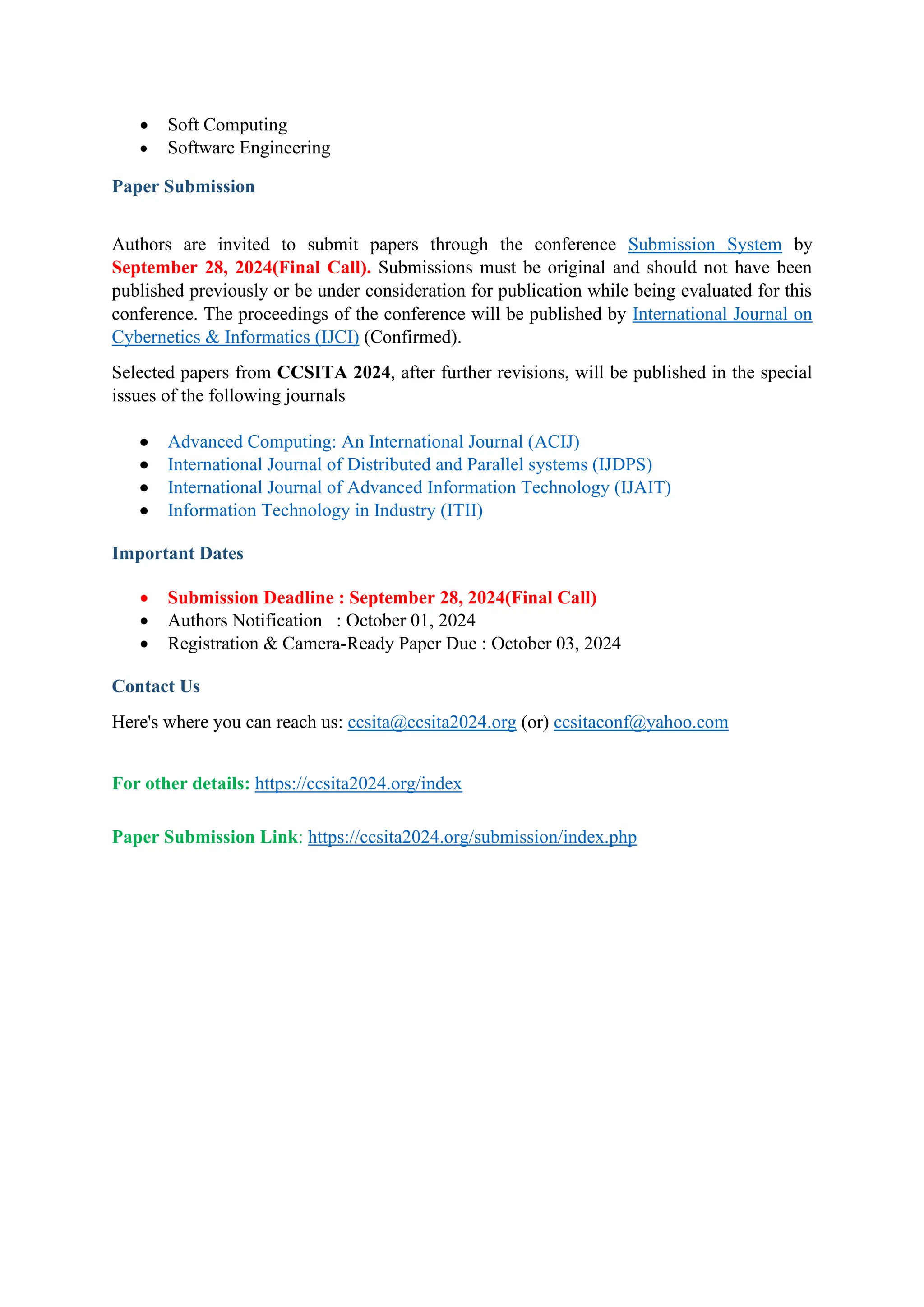 The 2nd International Conference on Computer Science and Information Technology Advances (CCSITA 2024) will take place virtually on October 5-6, 2024, aiming to share advancements in computer science and IT. Key topics include artificial intelligence, big data, machine learning, and cybersecurity, with a submission deadline of September 28, 2024. Accepted papers will be published in reputable journals, providing a platform for researchers and practitioners to exchange cutting-edge ideas.