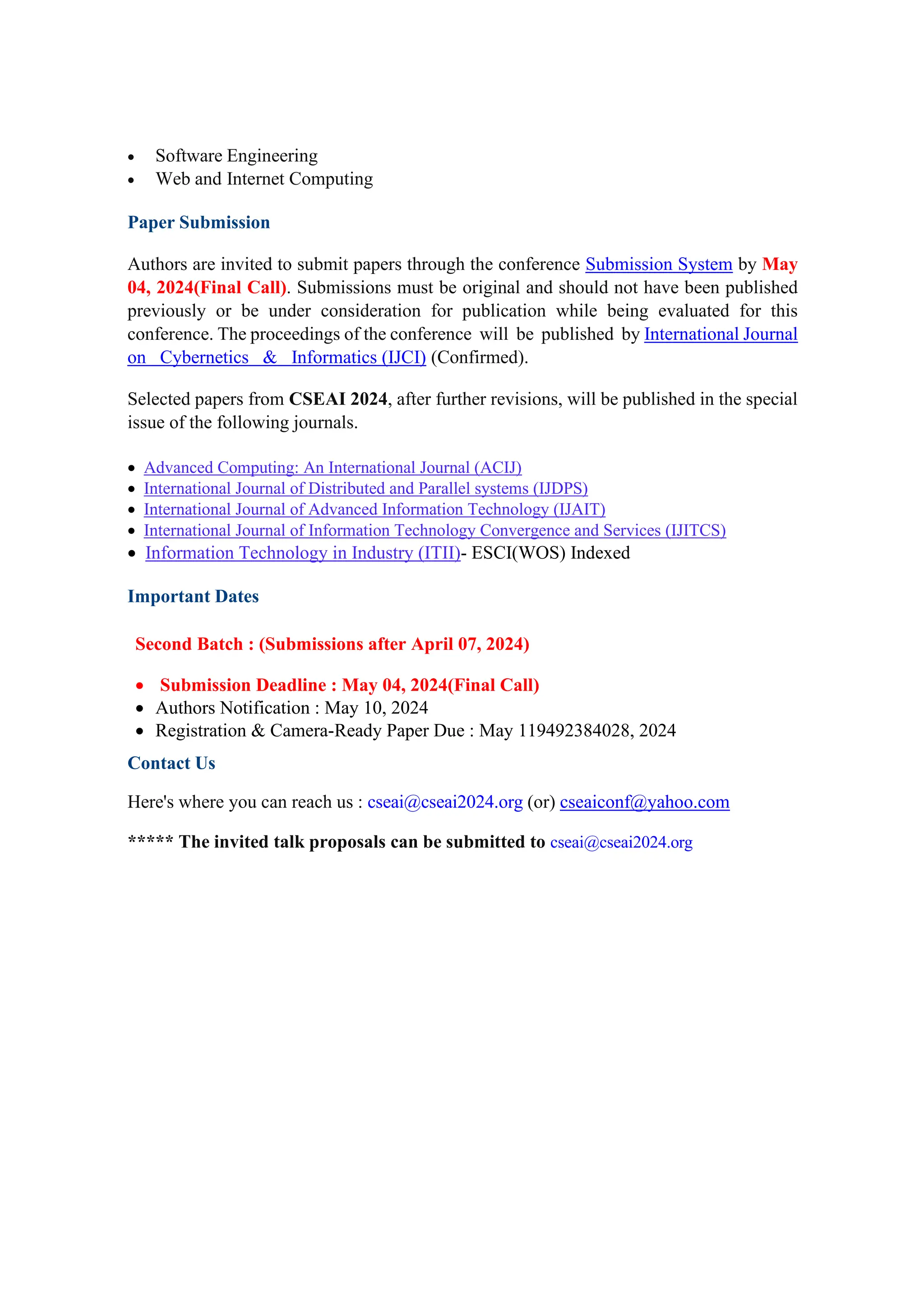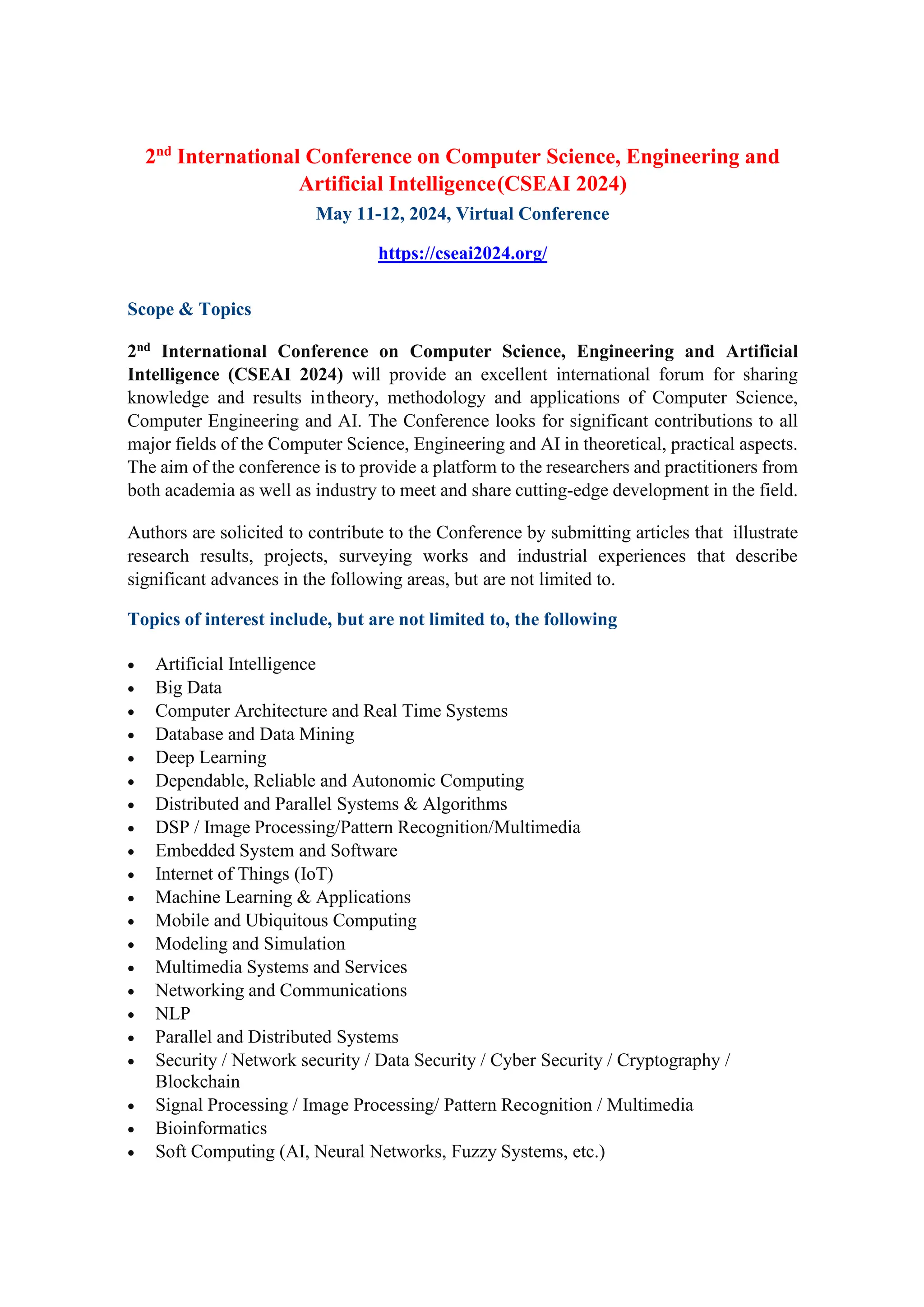The 2nd International Conference on Computer Science, Engineering and Artificial Intelligence (CSEAI 2024) will take place virtually on May 11-12, 2024, providing a platform for the sharing of knowledge in various fields related to computer science and AI. Authors are encouraged to submit original papers by May 4, 2024, with selected works to be published in associated journals. Topics of interest include artificial intelligence, big data, machine learning, cybersecurity, and more.