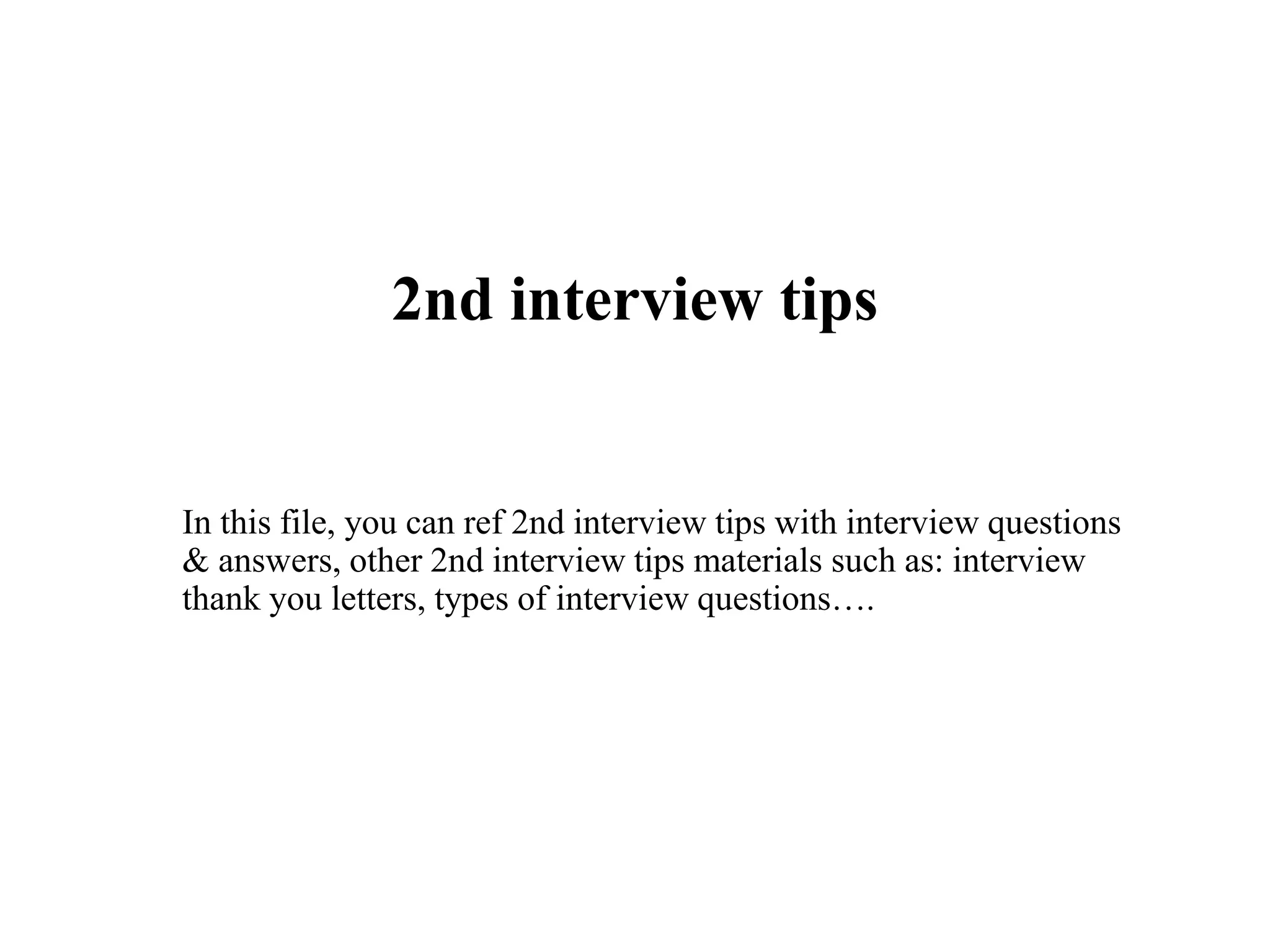 This document provides tips and resources for a second job interview. It outlines 7 key tips: 1) conduct research on the employer and job, 2) prepare responses to common interview questions, 3) arrive 15 minutes early and prepared, 4) make a good first impression to everyone, 5) be mindful of body language, 6) ask insightful questions, and 7) thank the interviewer both in person and follow up. It also includes links to additional interview questions, tips, examples and free resources to help prepare for a second interview.