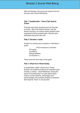 This document summarizes the activities and tasks completed during the Comenius 2013-2015 project on social well-being. It discusses four modules focused on how students feel at school, volunteering, social networks, managing stress, and time management. Some of the tasks included having students fill out a questionnaire on how they feel at school, creating a volunteer's guide, and presenting on social networks. The document also describes partner visits to Lithuania and Poland where students presented their results and participated in workshops on managing stress, ergonomics, and art therapy.