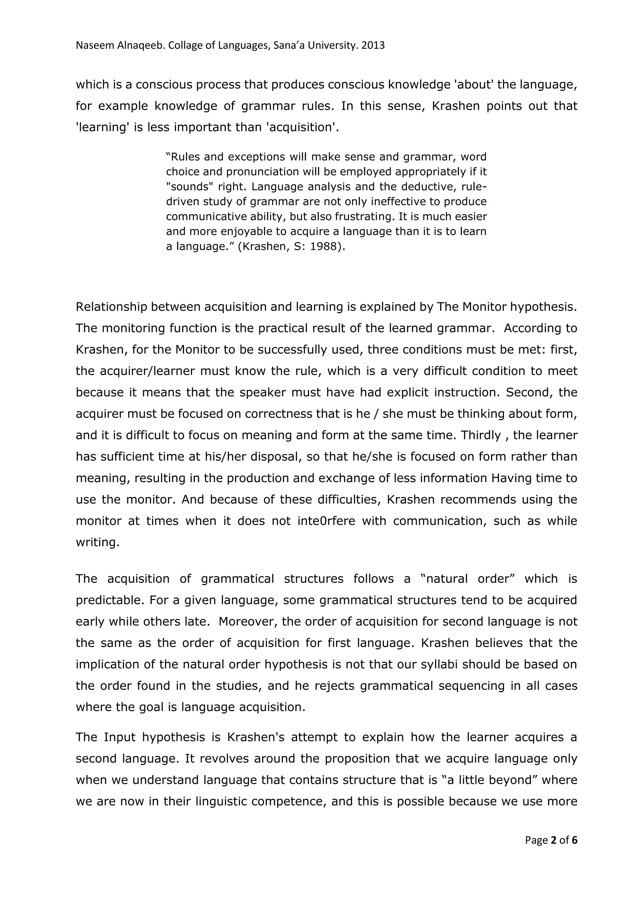 This document compares and contrasts second language acquisition theory and second language pedagogy. It discusses Stephen Krashen's Monitor Model theory, which posits that language is acquired through meaningful interaction rather than formal instruction. Language acquisition is a subconscious process, whereas learning is a conscious process. It also notes differences in how children and adults acquire a second language. Overall, it finds that while acquisition happens naturally, learning requires formal instruction and benefits from teaching methods, but acquisition allows for near-native fluency.