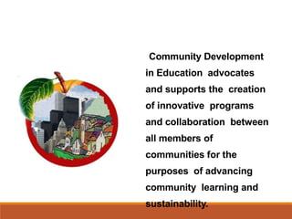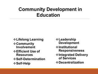 Community development in education advocates for creating innovative programs and collaboration between community members to advance community learning and sustainability. It aims to equip communities with the skills needed to undertake activities of their choosing. Key aspects of community development in education include lifelong learning, community involvement, efficient use of resources, self-determination, self-help, leadership development, institutional responsiveness, integrated delivery of services, and decentralization. Community educators work with people of all ages across a variety of settings and programs to address community needs through learning and prepare individuals for active community life.
