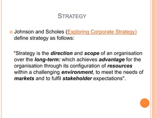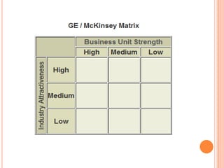 The document discusses strategic management tools including the GE/McKinsey matrix, which analyzes a company's business portfolio based on industry attractiveness and business unit strength. It explains how to calculate these factors and provides an example analysis of Apple Inc. The matrix is useful but also has limitations as it does not account for relationships between units or core competencies.