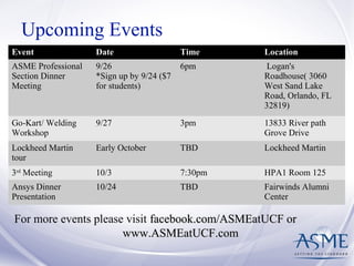 The document lists upcoming events for the UCF chapter of the American Society of Mechanical Engineers (ASME). It announces an ASME professional section dinner meeting on September 26th, a go-kart and welding workshop on September 27th, a potential Lockheed Martin tour in early October, the chapter's third general meeting on October 3rd, and an Ansys dinner presentation on October 24th. It also provides information about the student design competition team, guest speaker Herbert Yamada who works at NASA and Lockheed, and encourages attendees to like the ASME at UCF Facebook page. The next meeting is a resume workshop on October 3rd.