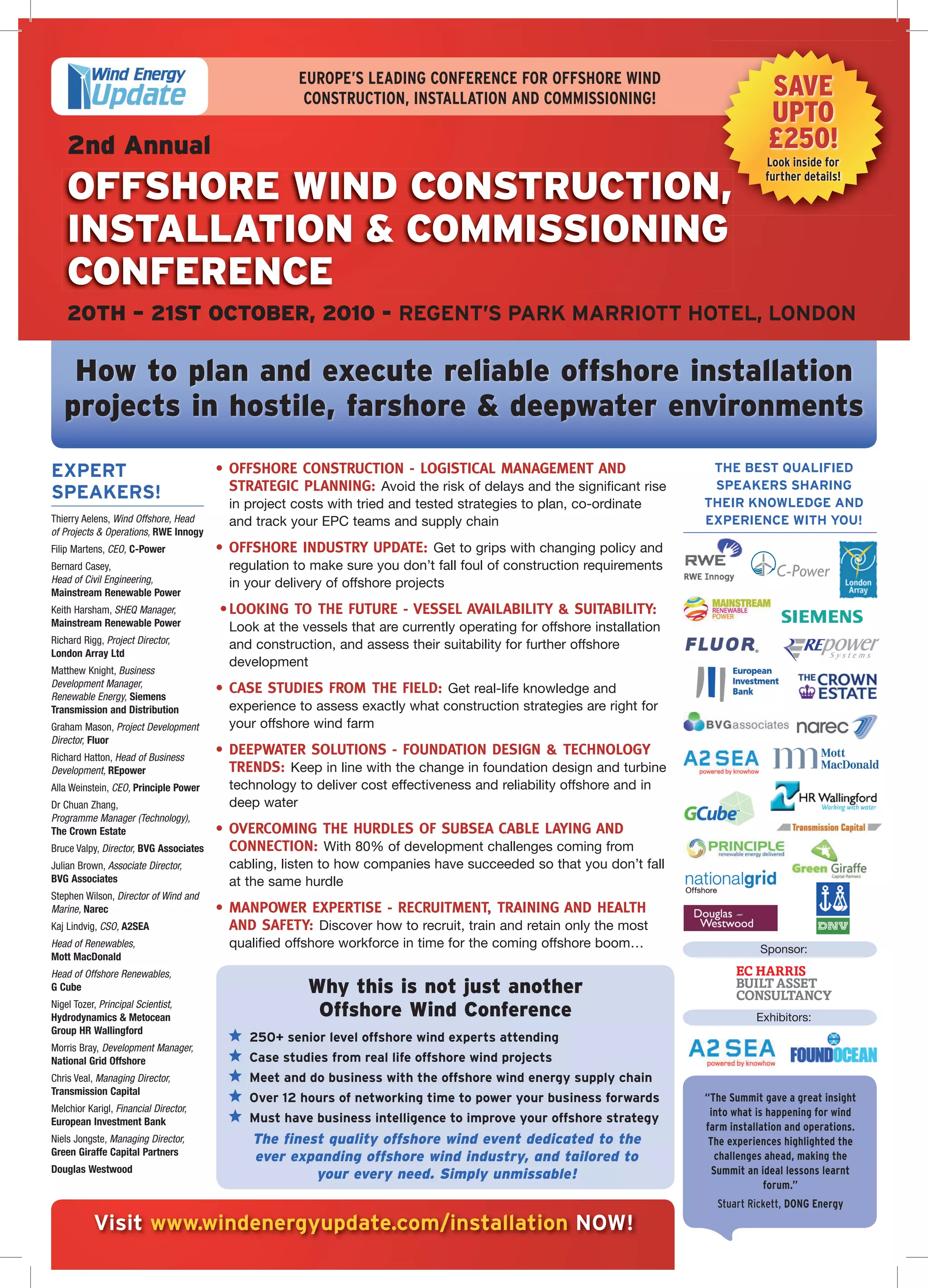 The document advertises a conference focused on offshore wind construction, installation, and commissioning, scheduled for October 20-21, 2010, in London. It highlights expert speakers, case studies, and discussions on logistics, policies, vessel suitability, and workforce training aimed at overcoming challenges in offshore wind projects. Attendees will gain insights, share experiences, and network with over 250 industry professionals to enhance their offshore strategies.
