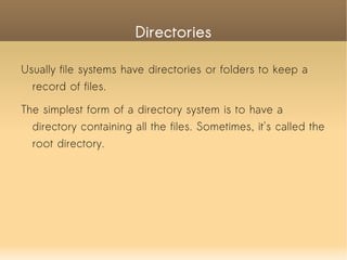 Directories and folders are used to organize files in a file system hierarchy, with the root directory containing all other files and subdirectories. There are two types of links that can reference files - hard links have equal weighting and both names point directly to the data blocks, while symbolic links refer access back to the main file name through a file name table entry.