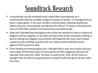 The document discusses planning for a student film project about a husband racing against time to save his kidnapped wife. It covers researching suspenseful music to use in the soundtrack, conducting vox pops to understand audience preferences for horror/thriller genres, researching BBFC film ratings, outlining a project plan and shoot schedule, and taking location photos to use in editing. The goal is to create a 15 rated short film trailer that balances horror and suspense to engage their target 17-30 year old audience.
