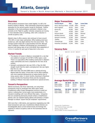 While Atlanta's office vacancy rates remain high around 19-20% and rental rates have leveled off, the biggest submarket of Buckhead is experiencing positive absorption due to companies moving to more desirable areas with reduced costs. Major transactions in the second quarter included several lease and renewal deals for office spaces over 20,000 square feet. The lack of new office construction in the city and Georgia's continued high unemployment rate are also influencing the tenant's market.