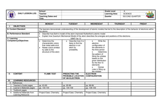 The document outlines a lesson plan for teaching 9th grade science students about atomic structure and chemical bonding. On Monday, students will learn about flame tests and Bohr's model of the atom. On Tuesday, they will learn about predicting electron location and quantum mechanical models. On Wednesday, students will learn electron configurations. The rest of the week covers ionic bonding on Thursday and covalent and metallic bonding on Friday. The plan details learning objectives, resources, procedures, assessments and reflections for teaching these topics over the course of the week.