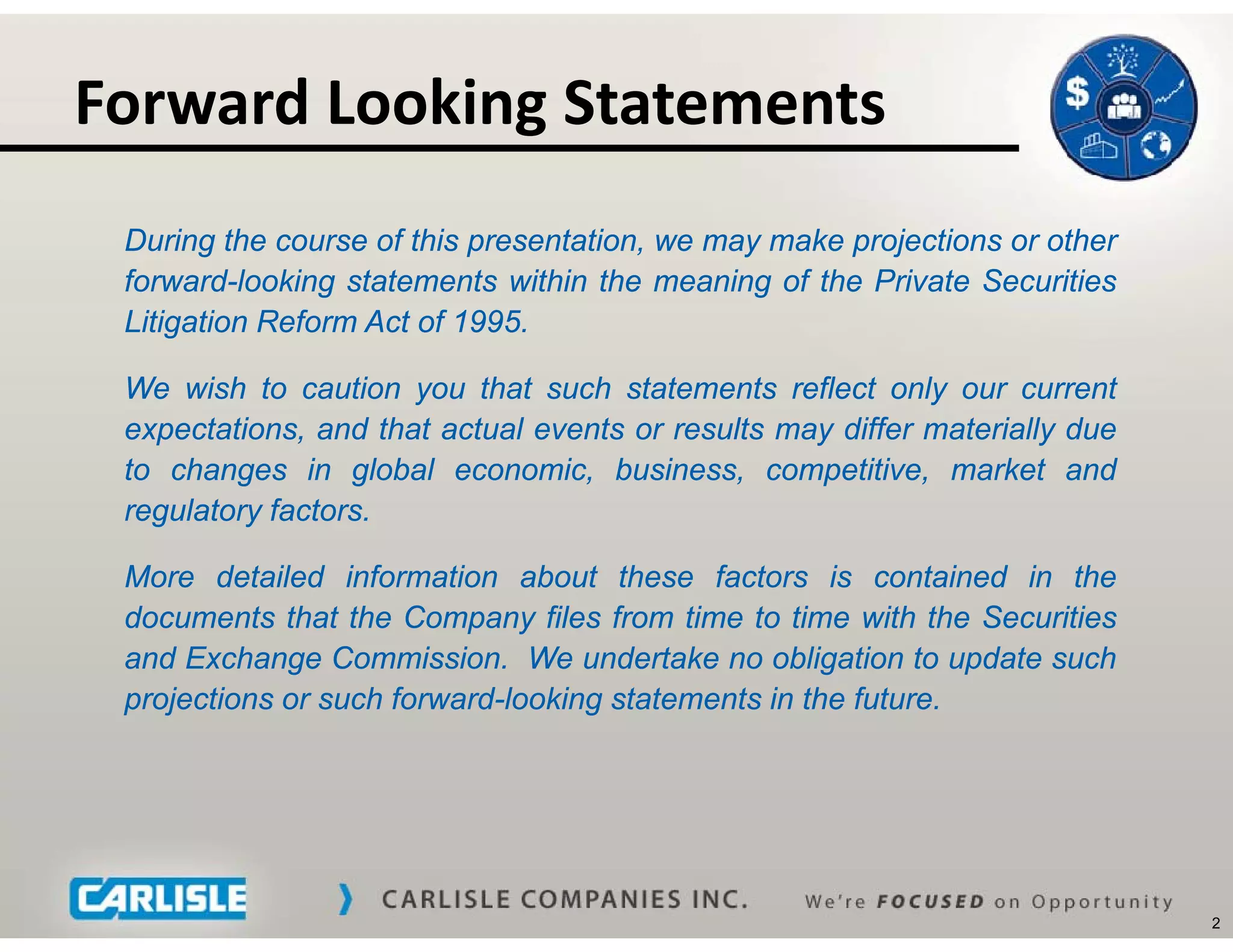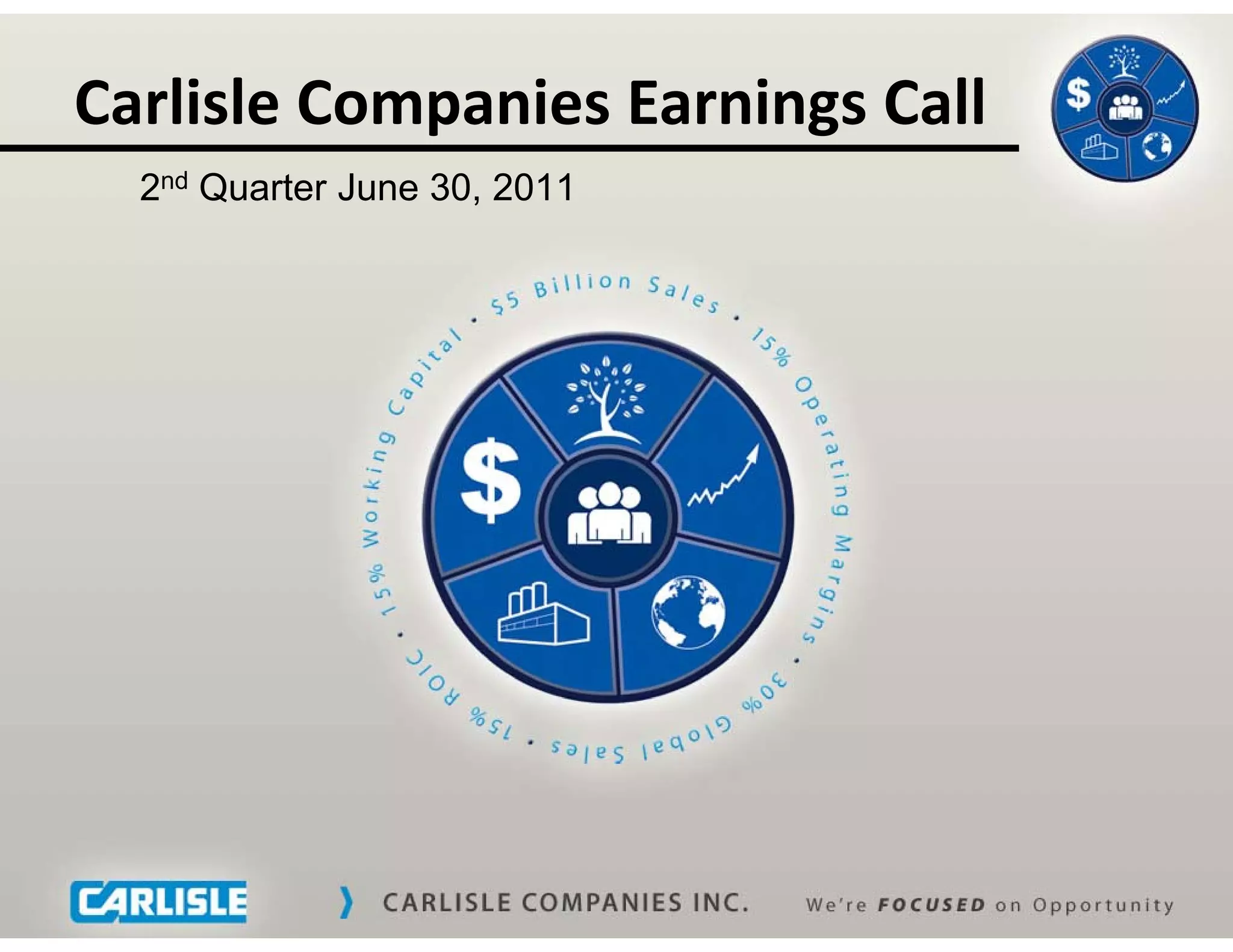 Carlisle Companies reported strong financial results for the 2nd quarter of 2011. Net sales increased 27% to $870.8 million, driven by a 14% increase in organic sales and a 12% contribution from acquisitions. Earnings before interest and taxes grew 33% to $85.4 million, with margins expanding 50 basis points to 9.8%. Continued sales and earnings growth was achieved despite pressure from rising raw material costs. The results reflected outstanding performance from the Brake & Friction segment, which saw a 356% increase in sales and 510 basis point expansion in margins due to the Hawk acquisition. Carlisle remains well positioned for further growth through investments in acquisitions, new product development and