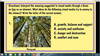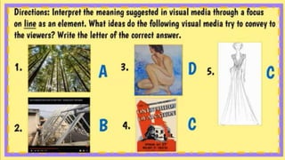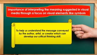 This document discusses various forms of media like newspapers, magazines, and digital formats. It also mentions symbols, gazes, frames, demands, and offers in the context of interpreting meanings suggested in visual media, with a particular focus on how color and gaze can influence interpretation.