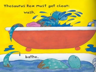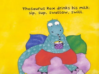 A thesaurus is a book that lists synonyms and antonyms for words to help improve writing by finding new words with similar or opposite meanings. Synonyms are words with similar meanings, while antonyms are words with opposite meanings. The thesaurus allows writers to explore new vocabulary and precisely convey their intended meaning.