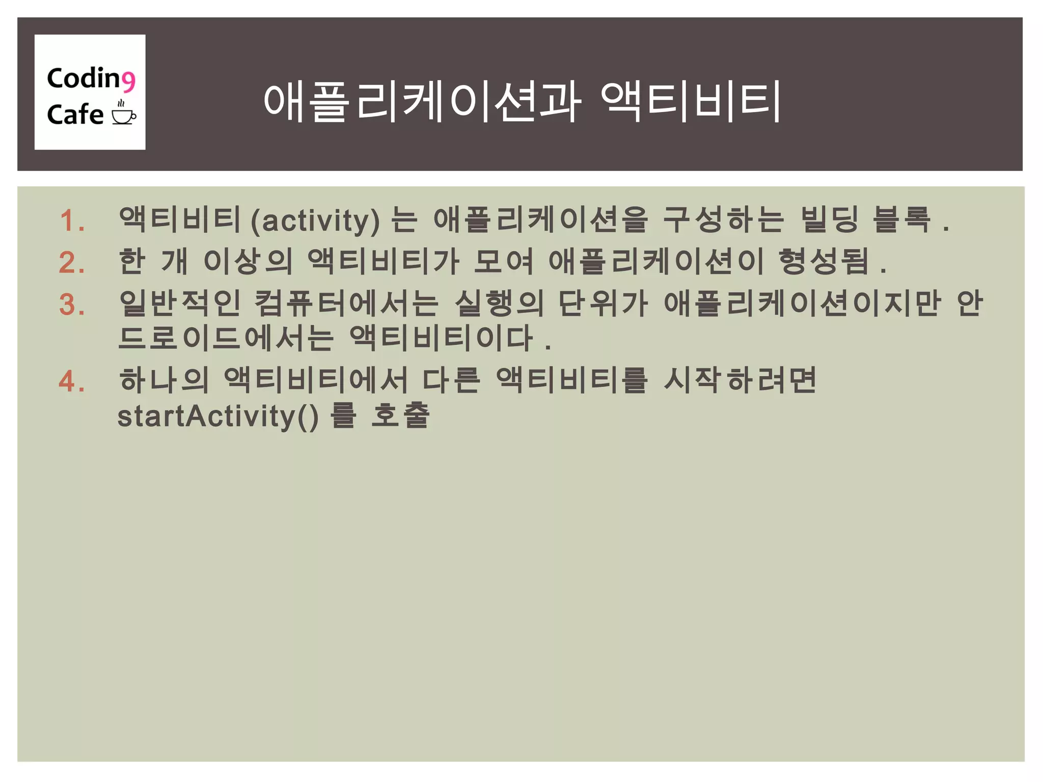 는 애플리케이션을 구성하는 빌딩 블록 . 2. 한 개 이상의 액티비티가 모여 애플리케이션이 형성됨 . 3. 일반적인 컴퓨터에서는 실행의 단위가 애플리케이션이지만 안 드로이드에서는 액티비티이다 . 4. 하나의 액티비티에서 다른 액티비티를 시작하려면 startActivity() 를 호출 애플리케이션과 액티비티