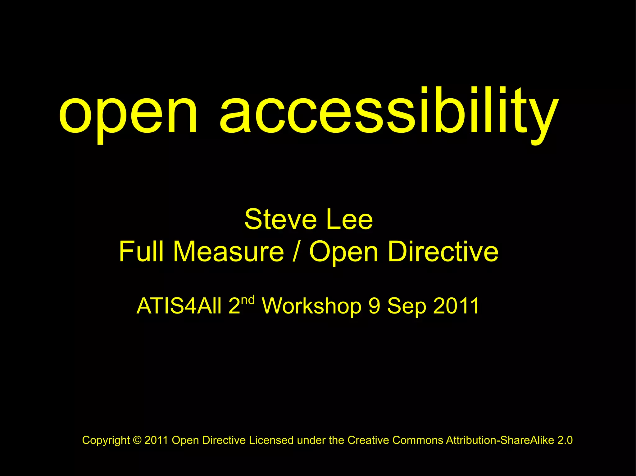 This document discusses open accessibility and the ATIS4ALL project. It advocates for open source and open development approaches to create more accessible software and technologies through collaboration between users, developers, researchers, and companies. The ATIS4ALL project aims to create an online portal that allows users to search for and download assistive technology information and resources through a multilingual interface. It also aims to facilitate an online community for sharing, participation, and connecting key stakeholders in accessible technology.