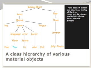 The document provides an overview of object-oriented programming (OOP) concepts, illustrated through the example of sending flowers to a friend. It explains key OOP principles such as agents (objects), messages and methods, classes and instances, and emphasizes the importance of encapsulation, inheritance, and polymorphism in application design. Additionally, it discusses Java's features, control structures, and basic programming concepts, including constructing and invoking methods.