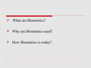 This document discusses iris biometrics for person identification. It begins by defining biometrics and explaining why they are used. It then focuses on iris biometrics, describing how the iris is unique, how iris recognition systems work to capture images and extract iris codes for identification, and the techniques involved like localization, normalization and enhancement. It compares iris recognition to other biometrics like fingerprints in terms of accuracy, stability, speed and security. It concludes by discussing current and future uses of iris biometrics with references.