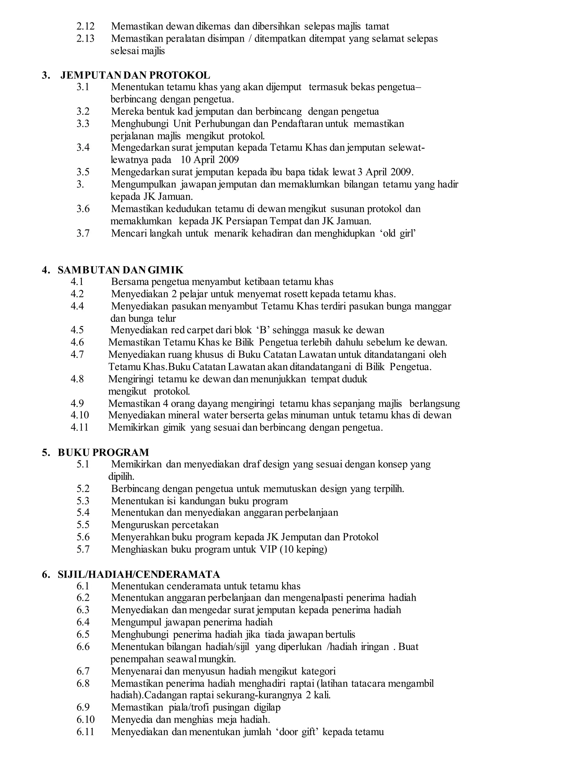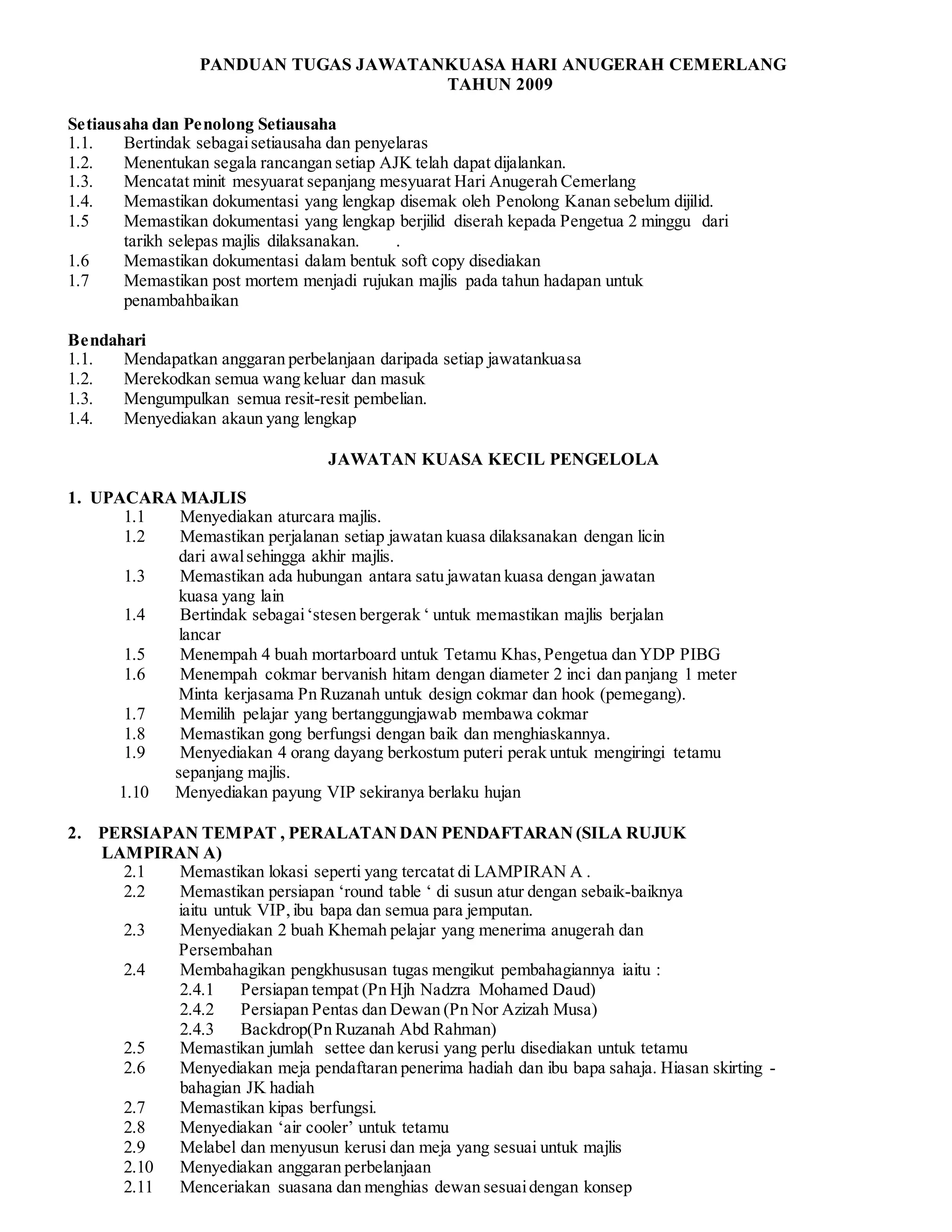 Dokumen ini adalah panduan tugas untuk jawatankuasa pelaksanaan hari anugerah cemerlang tahun 2009, termasuk tanggungjawab setiausaha, bendahari, dan jawatankuasa kecil dalam memastikan majlis berlangsung dengan lancar. Ia merangkumi perancangan, penyediaan, jemputan, jamuan, persembahan, fotografi, dan kebersihan. Setiap jawatan dalam jawatankuasa mempunyai spesifik tugas dan anggaran perbelanjaan untuk memastikan kelancaran majlis.