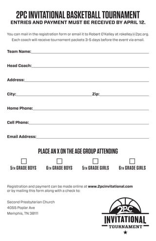 The document advertises a youth basketball tournament hosted by Second Presbyterian Church in Memphis, Tennessee from April 25-27, 2013. It is open to boys in 5th and 6th grade and girls in 5th and 6th grade, with a limit of 10 teams for each age group. Each team is guaranteed 4 games. The entry fee is $200 and discounts are available for multiple teams. Games will be played on regulation courts in an air-conditioned gym. Awards will be given for 1st, 2nd, and 3rd place and for MVP and all-tournament team. The deadline to register and pay is April 12.