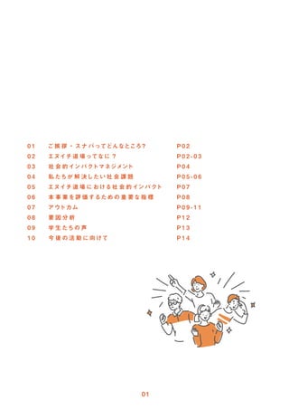 挑戦者を応援するコミ ュニティの創出」 (p.07) におけるコミ ュニティの可視化や持続可能性の向上もその一つです。 さ らに 「要因分析」 (p.12) では、 「スナバ」 が本事業を運営をする中で、 地域起業家や地域企業との密接な関係性がイ ンパク トの最大化のために重要な要因と して挙げています。 次年度はこのサポ ー ト体制の輪をより広範囲に拡大し、 「エヌイチ道場」 内外において、 地域企業や学校との連携体制の強化も検討しています。 以上のよ うな新たな取り組みを導入していく ためにも、私たちのビジョ ンに近い想いを持つ方々や組織のみなさ ま と、何らかの形で関わらせていただけるよ う な仕組み づく りにも励みます。 令和 2 年度より、 シビッ ク・イ ノベーショ ン拠点 「スナバ」 で始動した 「エヌイチ道場」 は令和 4 年度末までに、 3 期、 計 29 名の高校生や高専生が参加しま した。 学生指導要領の改訂により、令和 4 年度から高校での 「総合的な探究の時間」 が必修化していること を踏まえ、高校生が課外活動に取り組む機会は増加傾向に あり ます。 しか し、 その多く は地域との継続的な関係性構築や学生の長期的な自己成長や発見より も、 カリキュラム内での実施や検証可能な内容であることが前提 におかれ、 学習内容も地域との単発的な関わりやデスクリサーチの域を超えないよ うなものが散見されます。 「エヌイチ道場」 では、地域のキーパーソンが出入りするコミ ュニティ 「スナバ」 が運営するプログラムだからこそできる、多様な起業家や地域の人々との設定の創出 や、 長期的視野で学生個人の成長に寄り添う、 地域を巻き込んだ面的な伴走支援体制を組むこと を心がけています。 しか し、 課題もあり ます。 高校生にと っての最も大きな試練は 「エヌイチ道場」 終了後、いかに事業や活動を継続させていく かです。 進学準備など、さ ま ざまな活動を両立しながらの事業継続 には、 金銭的・時間的・人的リ ソースなど、 さ ま ざまなリ ソースが必要となり ます。 彼ら をサポー トする体制を地域内で強めたり、 広げていく ことは、 高校生のチャ レンジや挑戦を後押しするだけにと どま らず、 さ ま ざまなひとが挑戦しやすい地域を創るこ とにつながり ます。 今期で 3 年目となった 「エヌイチ道場」 では、 第 1 期に参加した OB/OG たちが、 現役道場生の壁打ちをする光景も見られま した。 このことから、 こ の地域で 「エヌイチ道場」 を継続していく こと、 また、 支援体制の輪を広げていく ことの意義は年々強まっています。 第二回目の 「エヌイチ道場」 イ ンパク トレポー ト作成に向けて、 ご協力いただいたみなさ ま、 そ して、 これからつながっていく であろ うみなさ ま、 「エヌイチ道場」 を通して、 誰もが生きたいと願う、 私たちのまちの未来を、 一緒に創っていきませんか。