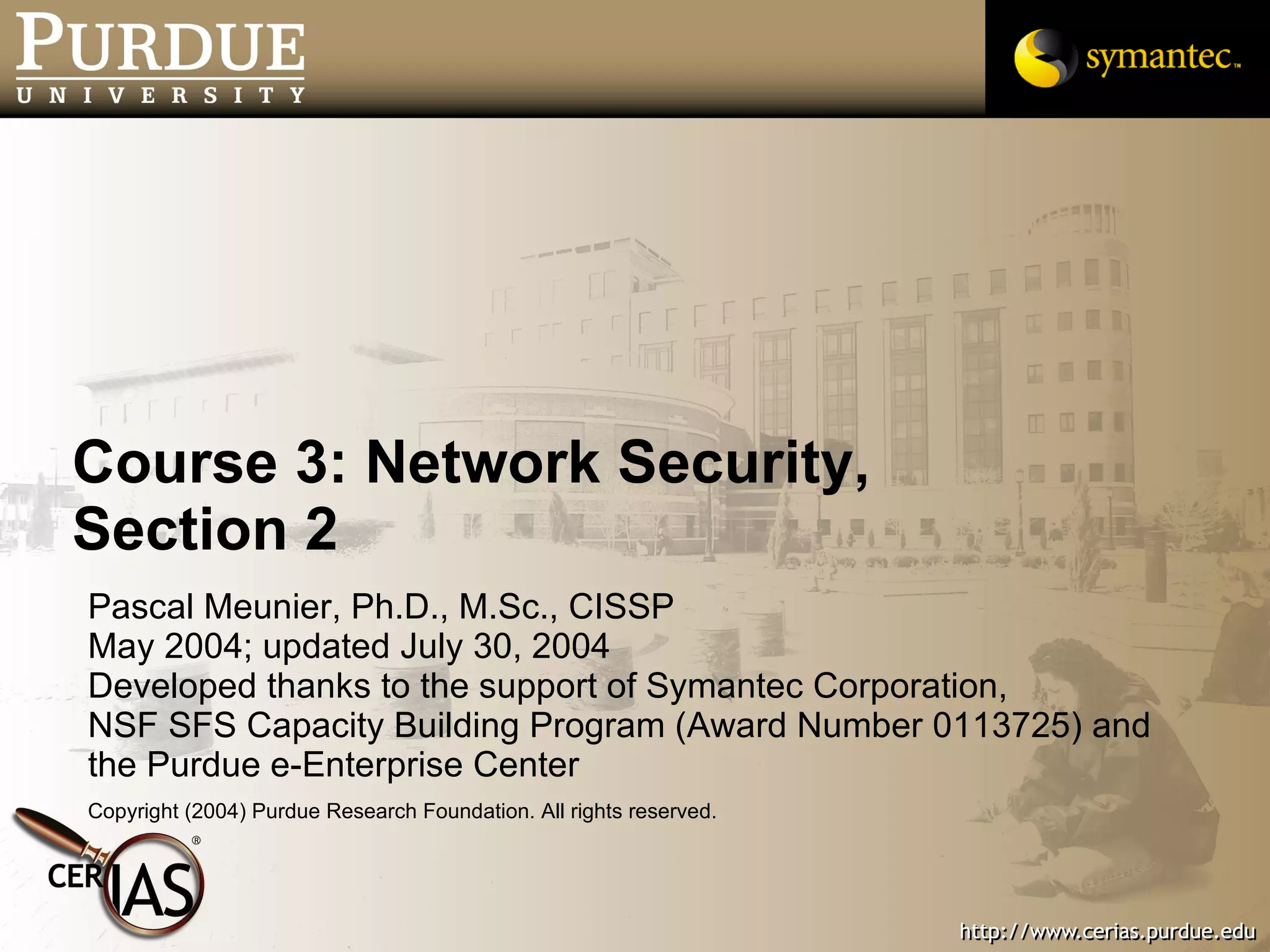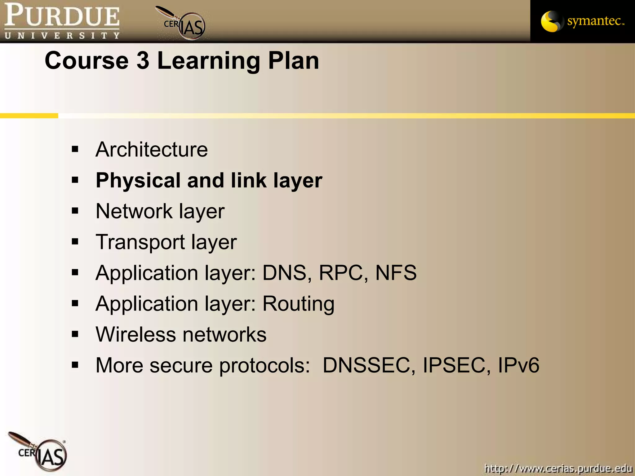 This document provides an overview and learning objectives for a course on network security. It covers topics like physical layer risks, link layer vulnerabilities, media access control, logical link control, ARP, and wireless network attacks. The goals are to understand vulnerabilities in network designs and protocols, and to identify tools that can detect relevant policy violations for each layer.