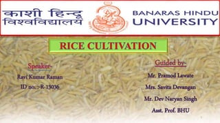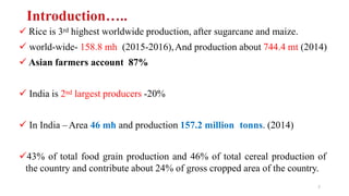 Rice is the third most produced cereal globally after sugarcane and maize. Most rice is produced in Asia, with India being the second largest producer, accounting for 20% of global production. The top rice producing states in India are West Bengal, Uttar Pradesh, Andhra Pradesh, Punjab, and Bihar. There are different varieties and methods of cultivation depending on factors like climate and soil conditions. Proper water, weed, pest and disease management is required to maximize yields, which average 60-70 quintals per hectare for mid-duration varieties in India. Rice will remain a critical crop as the world population grows and water availability challenges increase.