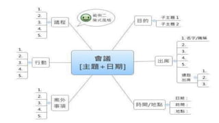 該文檔介紹了心智圖的概念及其在學習和思考中的應用,強調通過視覺化技巧激發大腦潛能。心智圖法能幫助使用者組織思維、增強記憶,並提供了製作心智圖的指導和應用範圍。文檔中還提及了心智圖法的歷史背景及其在個人和團體中的多種應用。