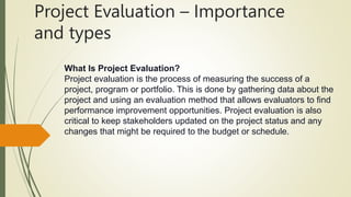 Project evaluation is the process of measuring the success of a project through gathering data and using evaluation methods. It allows identifying performance improvements and keeping stakeholders updated. Project evaluation criteria consider factors like time, cost, scope, and quality. There are various project evaluation methods including pre-project, ongoing, and post-project evaluation. Project appraisal involves a detailed evaluation of a project's political, social, environmental, technical, financial, and economic feasibility to determine its viability. It helps decide whether to accept or reject a project.