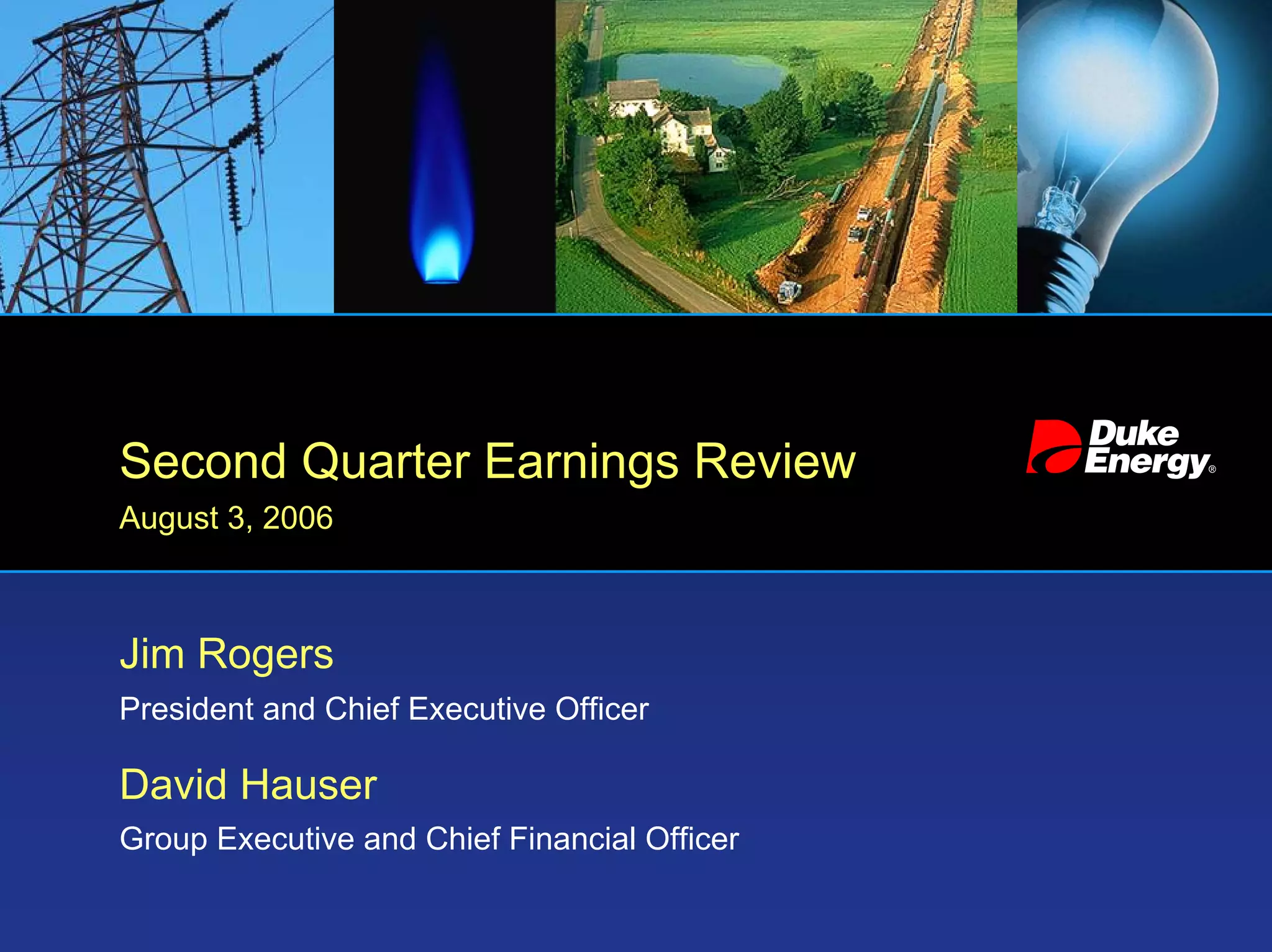 1) Duke Energy reported second quarter earnings of $0.28 per share but ongoing earnings of $0.43 per share, which excludes special items. 2) Key accomplishments in the quarter included closing the merger with Cinergy, announcing the sale of the commercial marketing and trading business, and announcing plans to spin off the gas business. 3) Segments like U.S. franchised electric & gas and natural gas transmission saw earnings increases due to the Cinergy merger and improved conditions.